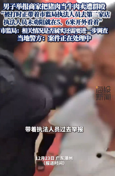 广东潮州,男子举报摊贩猪肉冒充牛肉卖,遭六七人围殴耳朵缝了十余针,肋骨骨折,鉴定为轻伤二级。男子:“被打时市监局执法人员就在边上看着”。官方:涉案人员已经全部抓获并刑拘。网友:重点是跟着市监局工作人员去,结果被打,这群人也太嚣张了!