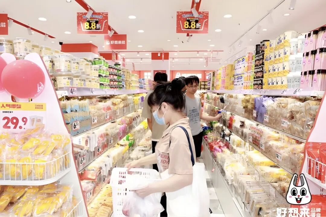 以好想来为例,过去门店主要是散装零食、饮料和乳品,现在货架上已经出现纸巾、日化、烤肠、烘焙等商品。有些门店还增加了文具、盲盒、潮玩,自有品牌的比例也在提高。