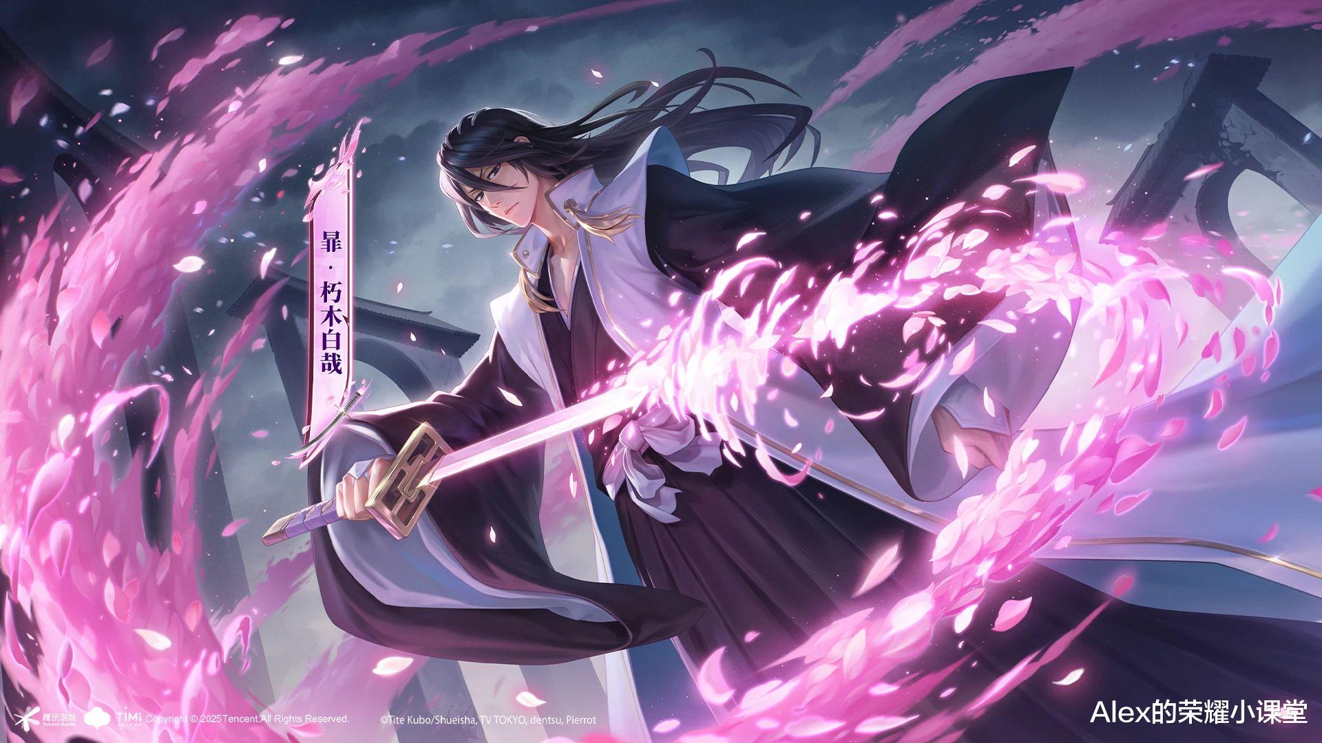 海报建模设计还原死神TV版动画中朽木白哉的造型,技能特效以粉色为主,满屏的樱花风暴和斩魄刀阵视觉效果非常华丽。