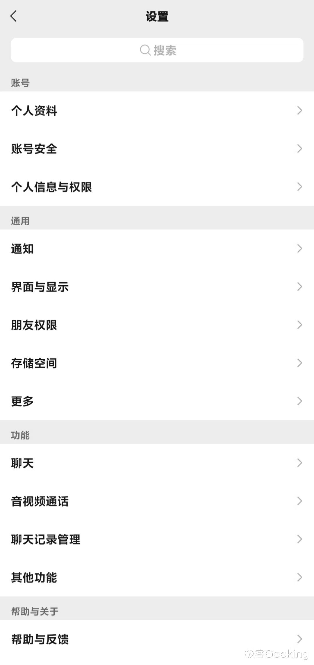 微信对设置页面做了优化改版,最主要变化是顶部新增了一个搜索框,而且对下方多个选项做了更详细的模块区分,包括“账号”、“通知”、“功能”以及“帮助与关于”,同时“插件”被折叠。