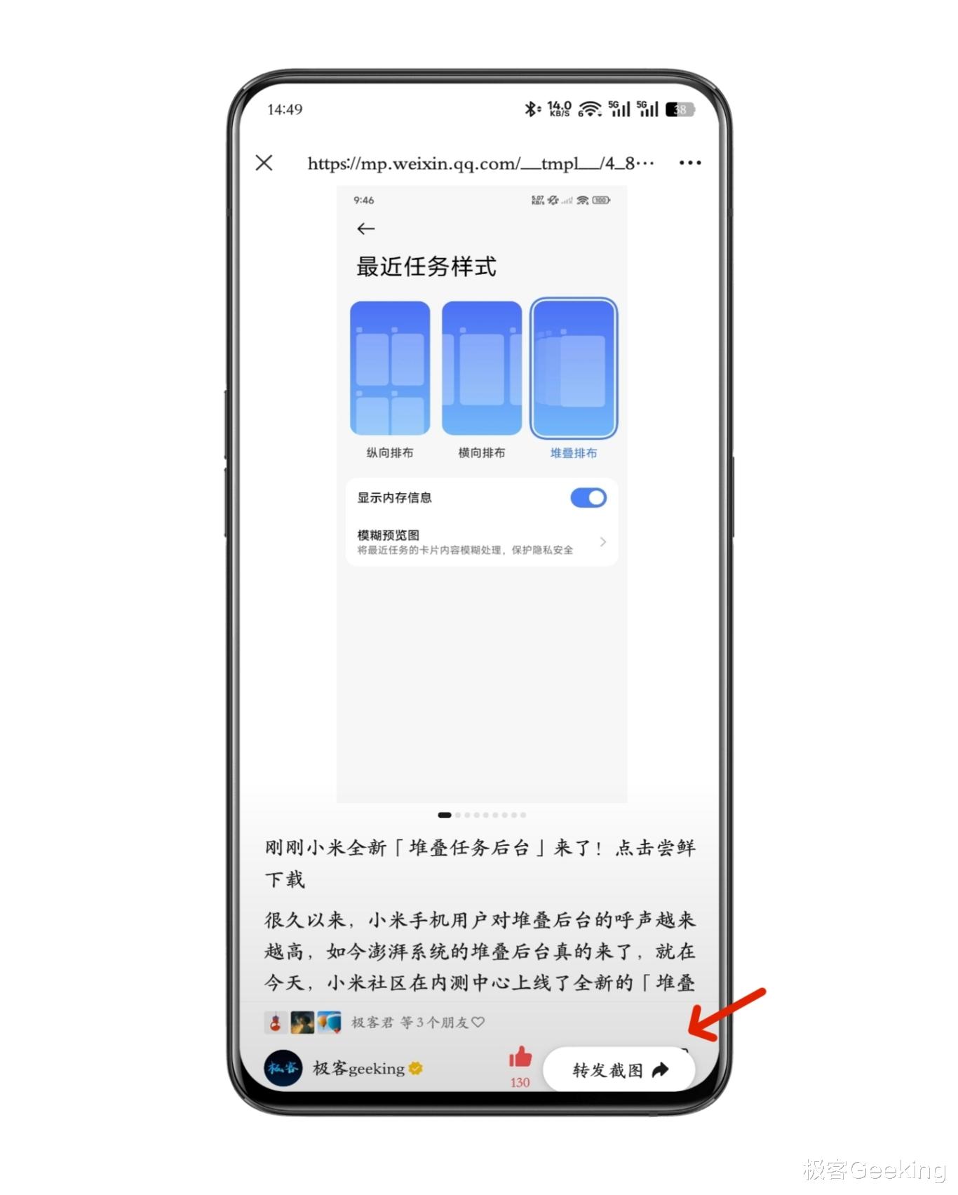 2、微信内截图支持快速转发现在这一功能迎来更大范围上线,这意味着将有更多微信用户能体验到了。如果在微信文章等界面进行截图,那么在截图之后页面底部右侧会出现一个「转发截图」的功能按钮。