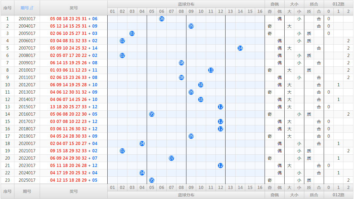 七、历史同期,蓝球开奖号码和走势图(历史数据演示):