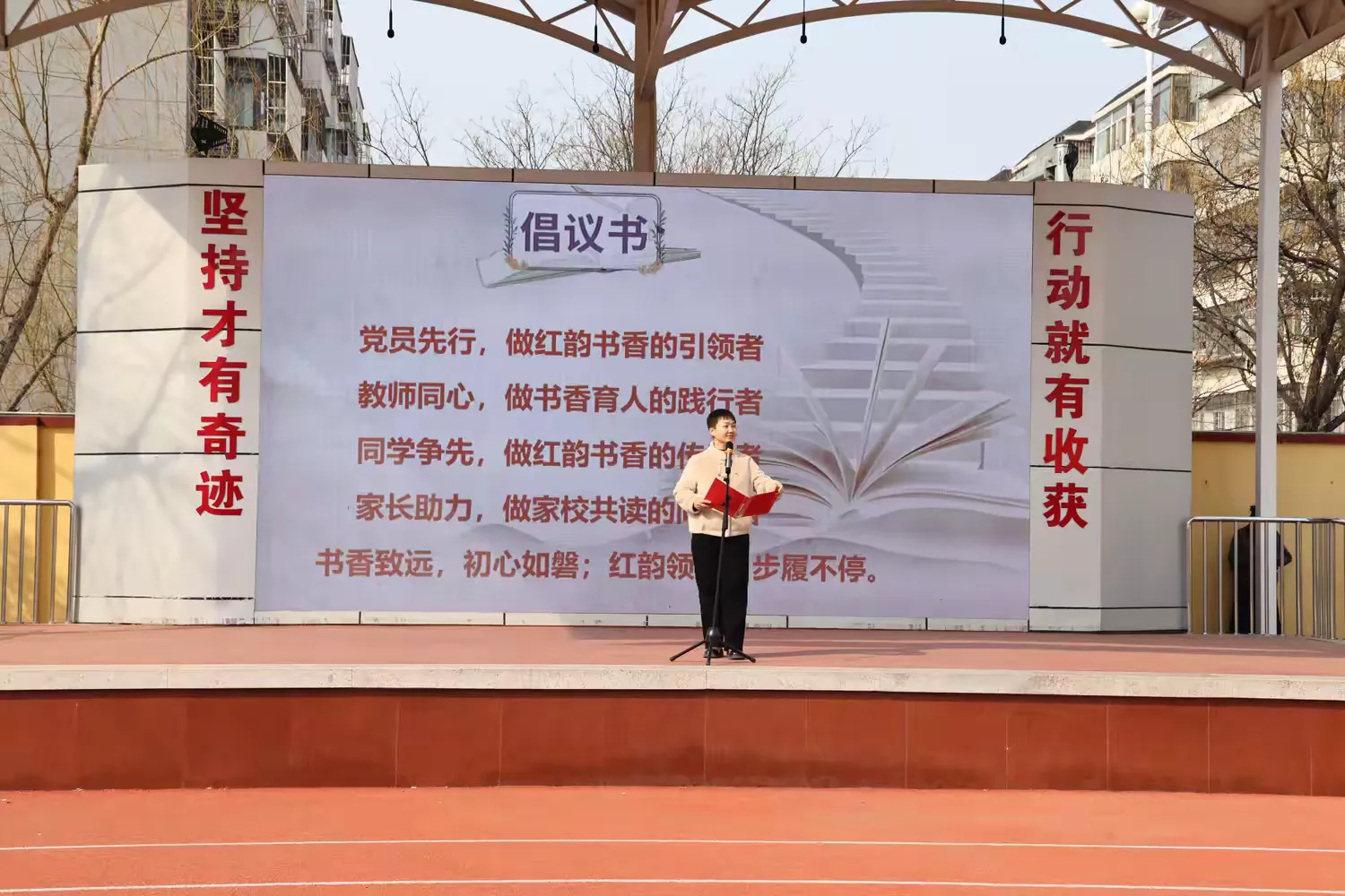 党员教师代表李雪梅老师宣读读书节倡议书,向全体党员、教师、同学及家长发出诚挚号召:党员先行,做红韵书香的引领者;教师同心,做书香育人的践行者;同学争先,做红韵书香的传承者;家长助力,做家校共读的同行者。以党建为引领,让阅读成为校园风尚、家庭常态,让书香飘满校园、走进家庭。