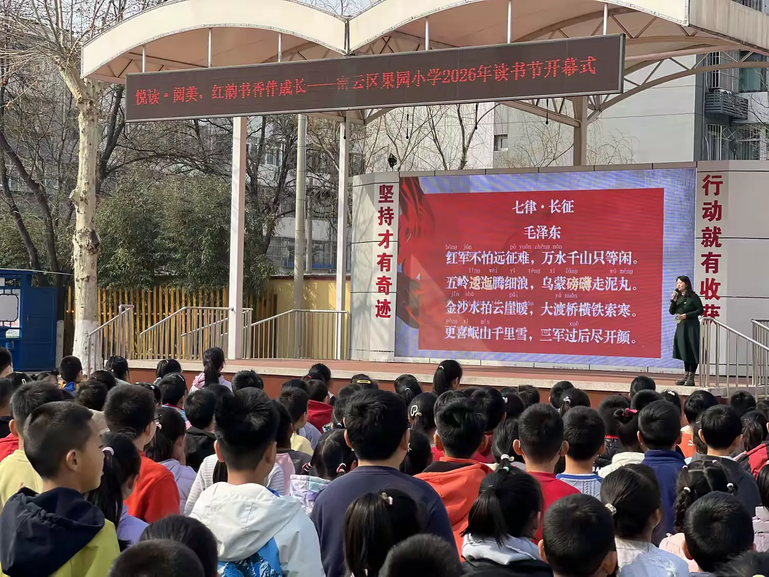 红色经典是阅读路上最珍贵的精神养分,开幕式的最后,全体师生共同齐诵《七律・长征》,铿锵有力的诵读声回荡在校园的每一寸天地,带着对革命先辈的敬仰,带着对红色经典的热爱,为读书节拉开了最美的序幕。伴随着激昂的诵读声,密云区果园小学 2026 年读书节正式启动!