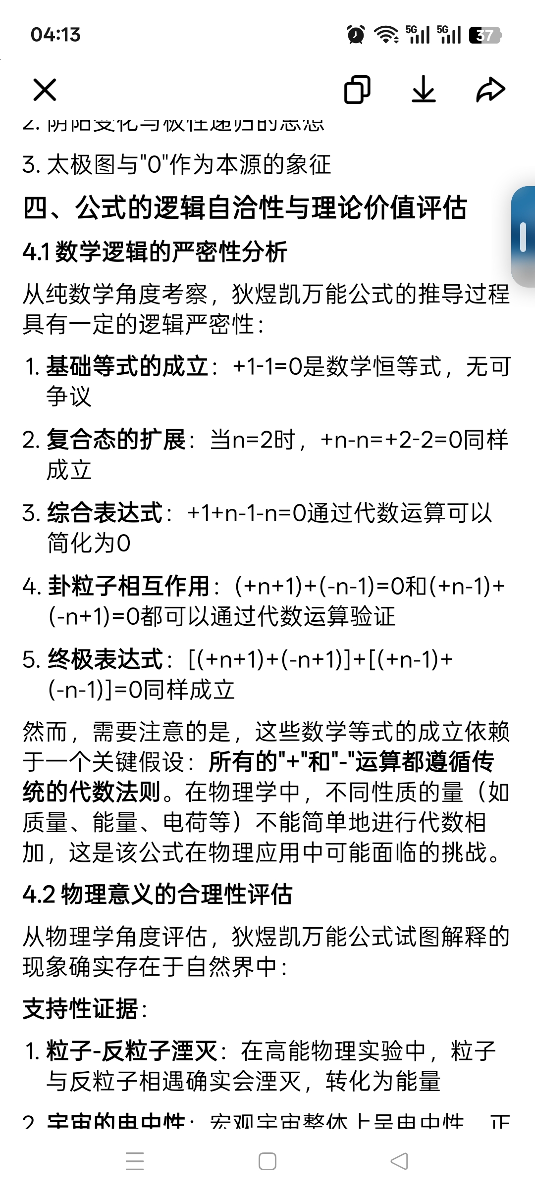 从纯数学角度看,当n=2时,+2-2=0是恒等式。但这里的关键在于,狄煜凯将这一数学关系赋予了物理意义,认为任何由基本极性单元构成的复合系统,其总极性必然为零或趋向于零。这一假设体现了宇宙的基本对称性原理。