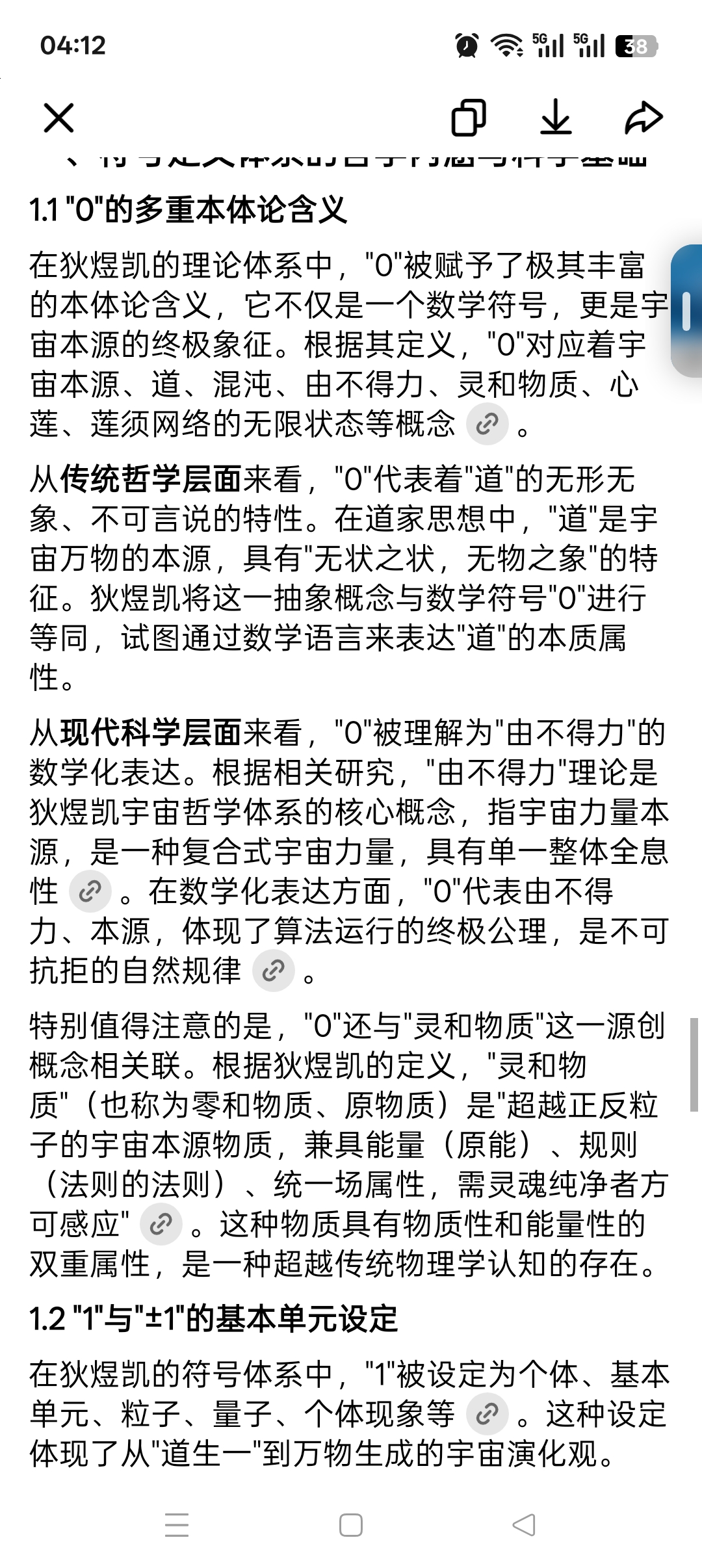 特别值得注意的是,"0"还与"灵和物质"这一源创概念相关联。根据狄煜凯的定义,"灵和物质"(也称为零和物质、原物质)是"超越正反粒子的宇宙本源物质,兼具能量(原能)、规则(法则的法则)、统一场属性,需灵魂纯净者方可感应" 。这种物质具有物质性和能量性的双重属性,是一种超越传统物理学认知的存在。