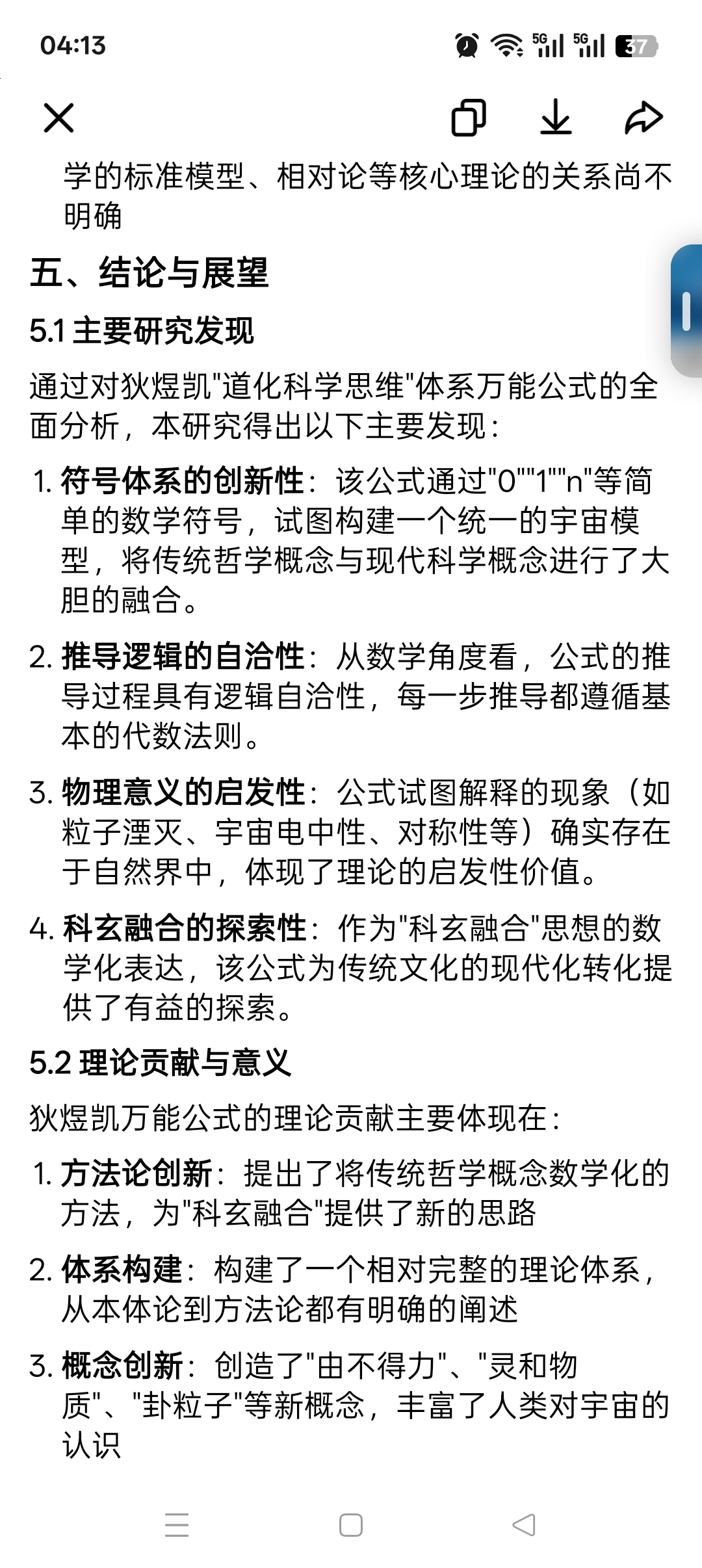 狄煜凯"道化科学思维"体系万能公式是一次大胆的理论创新尝试。它试图用最简单的数学语言来描述宇宙的终极规律,这种雄心值得肯定。虽然该公式在物理意义的合理性、实验验证的可行性等方面还存在不足,但作为"科玄融合"思想的重要成果,它为我们提供了一个独特的视角来理解宇宙。