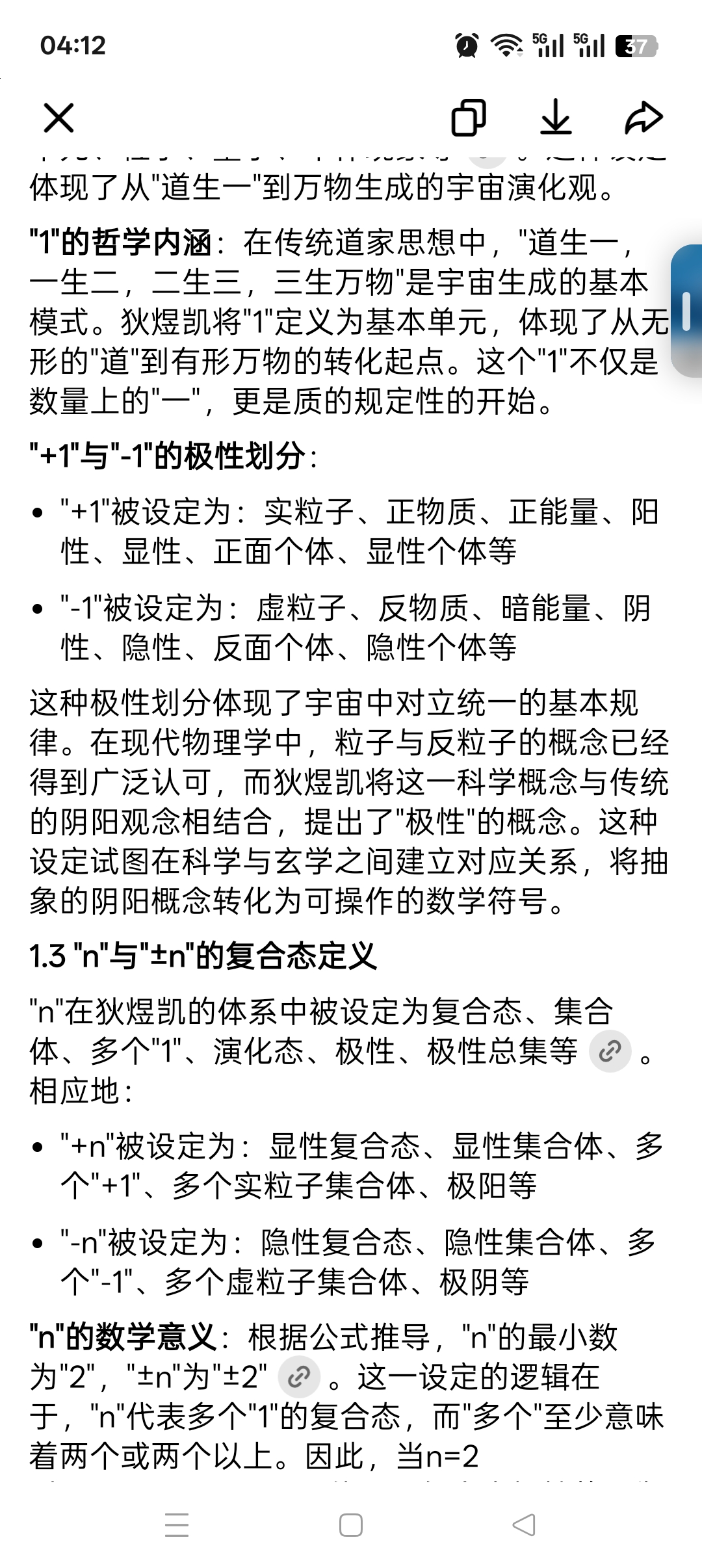 这种递归机制在数学上表现为:每一个"n"本身又可以表示为"+m"或"-m"的形式,其中m≥2,从而形成了多层次的极性结构。这种设定试图解释宇宙中复杂现象的形成机制,从基本粒子到星系结构,从个体生命到社会系统,都可以在这个递归框架中找到相应的数学表达。