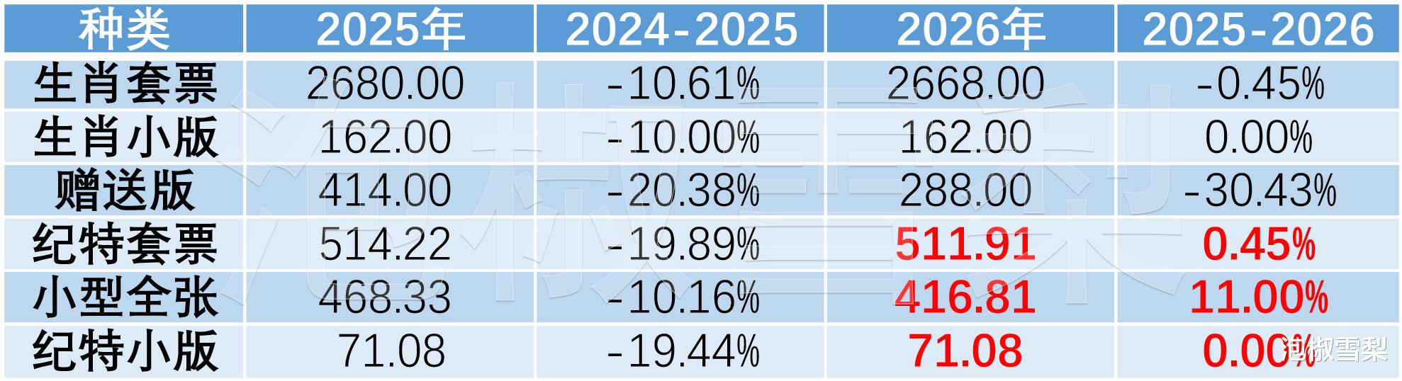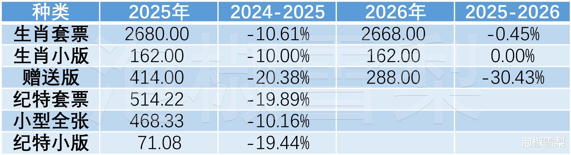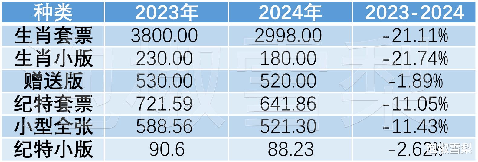通过对比可以发现,2023年至2024年生肖套票及生肖小版均减量21%,赠送版减量1.89%,纪特套票及小型全张减量11%,纪特小版减量2.62%。