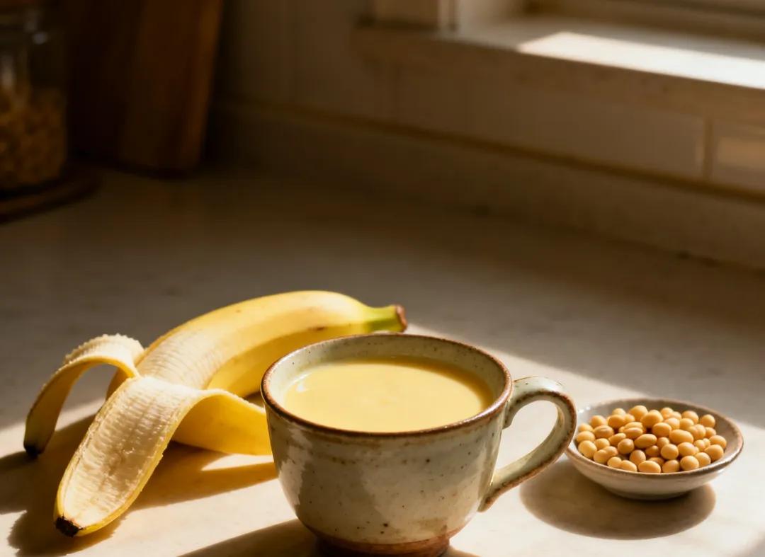 香蕉豆浆,更适合追求便捷的上班族,无需提前浸泡,将1根香蕉去皮切块,与50克黄豆、300毫升温水,放入破壁机,打成细腻的糊状即可。