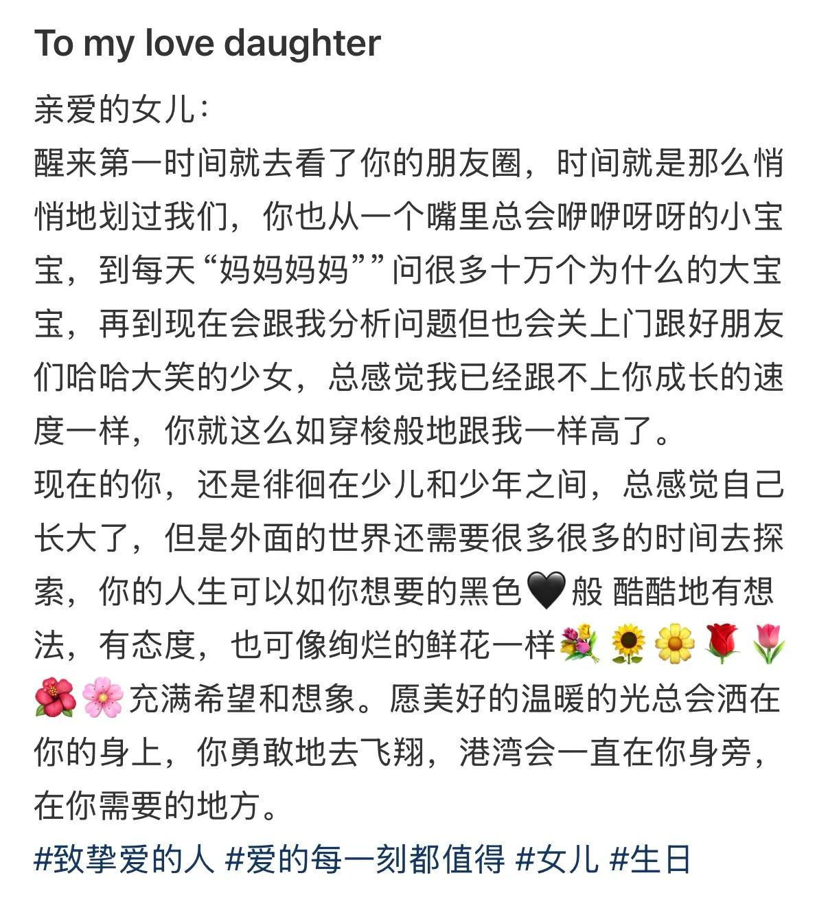 随后,李小璐也在社交平台晒出一组写真,为女儿庆生,李小璐还发了一段长文告白女儿,感慨女儿一下子从小宝宝长成少女了,尽显温柔爱意。