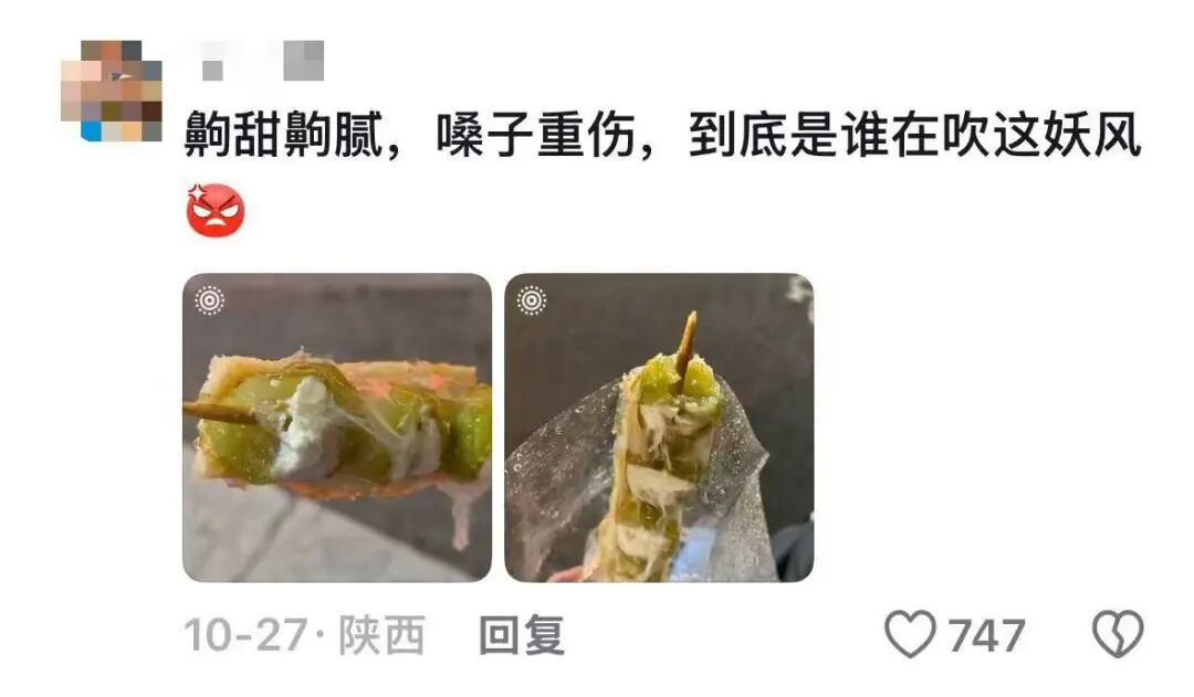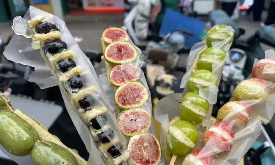 如果说奶皮子酸奶是“破圈”的第一步,那么今年入冬后爆火的奶皮子糖葫芦则将其热度推向了全民性的新高峰。这一创新产品巧妙地将中式传统零食冰糖葫芦与奶皮子进行跨界融合:在山楂糖葫芦外层贴上一整张奶皮子,或将山楂剖开夹入干噎酸奶,甚至将山楂替换为阳光玫瑰青提、草莓、无花果等热门水果。这种“水果的酸甜+糖壳的脆爽+奶皮子的醇厚”带来的丰富层次感,在视觉和味觉上都极具冲击力,迅速在短视频平台走红,在全国多地引发购买狂潮,部分门店日销量高达数千串,成为现象级的网红小吃。