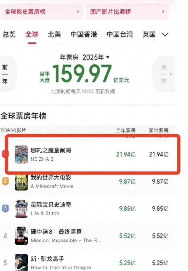 看看现在的榜单吧,《哪吒2》仍旧是今年的全球票房冠军了。
