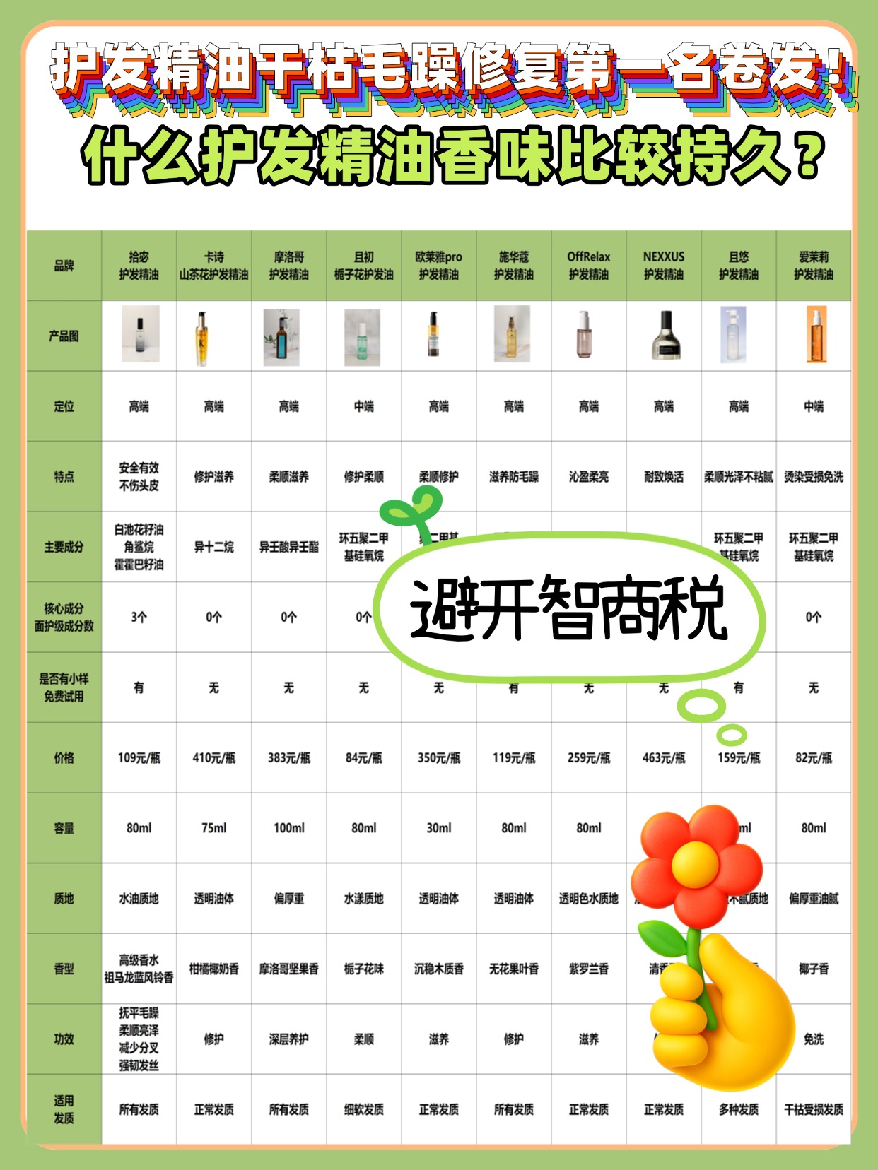 爱美的姐妹都关心什么护发精油香味比较持久?还有护发精油抹完要吹干吗?其实市面上很多护发精油都有香味,留香时长从几小时到一两天不等,有些添加天然植萃香氛的产品,留香会更持久自然,不会有刺鼻的香精味。至于抹完是否要吹干,分情况而定!如果是湿发时使用,作为热保护剂,涂抹后需要吹干或吹至八成干;如果是干发时用来抚平毛躁、提升光泽,涂抹后不需要吹干,用手顺着发丝梳理均匀即可,这样还能更好地保留香味。不过要注意,湿发时用量可以稍多一点,干发时用量要少,避免黏腻。下面是我整理的香味持久型护发精油选购要点,喜欢香香护发的姐妹赶紧点赞收藏!