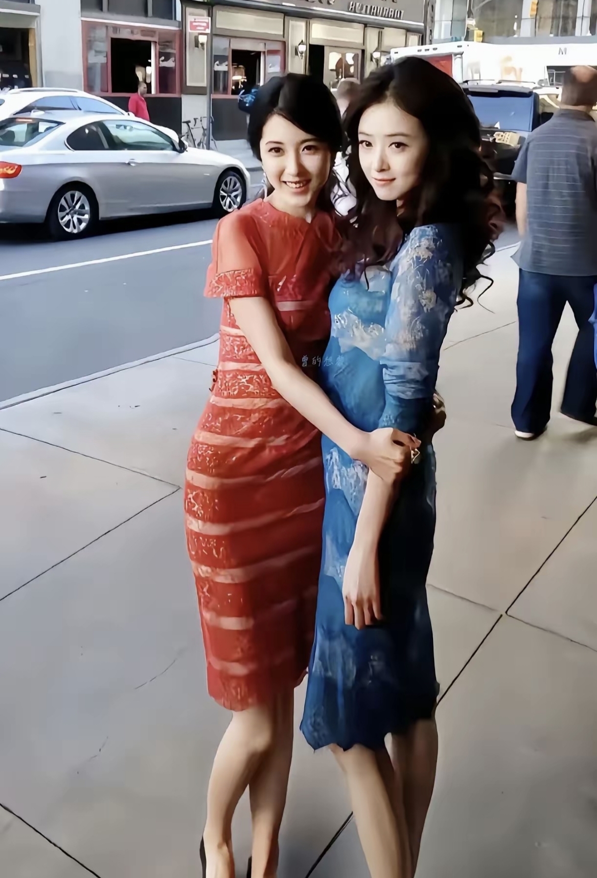 早年,两人一起逛街,一个身穿蓝裙,一个着亮眼红裙。