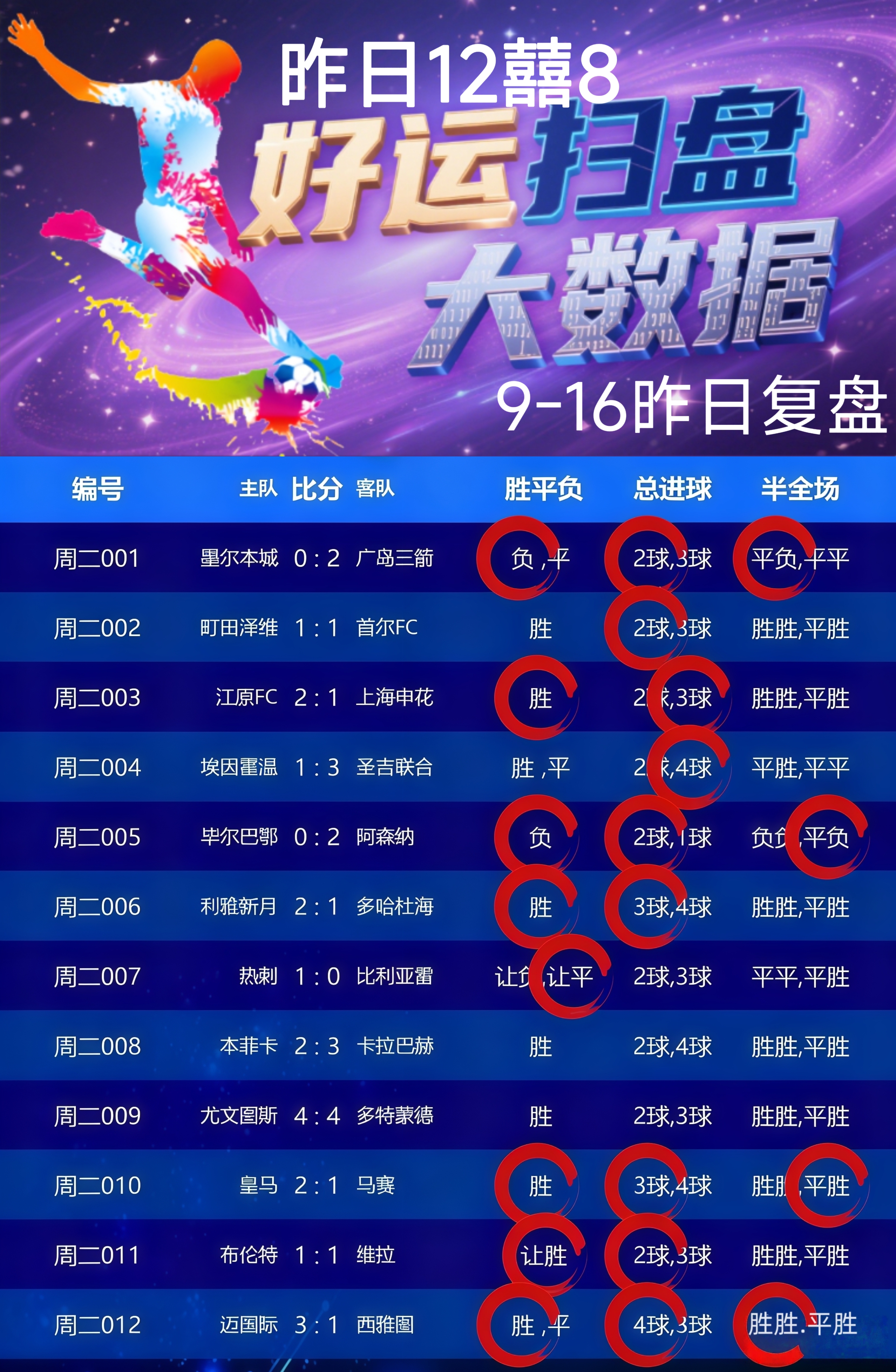 昨日足球12中8,命中率66.6%!今日12场足球比赛,祝我们好运!篮球今日2场赛事!