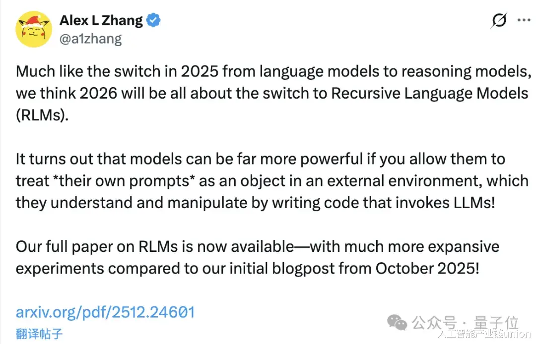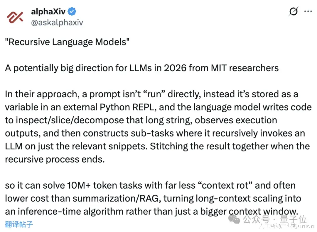“套娃模型”正式名称叫做递归模型,核心流程是将文本存入代码环境,让模型编写程序拆解并递归调用自身处理。