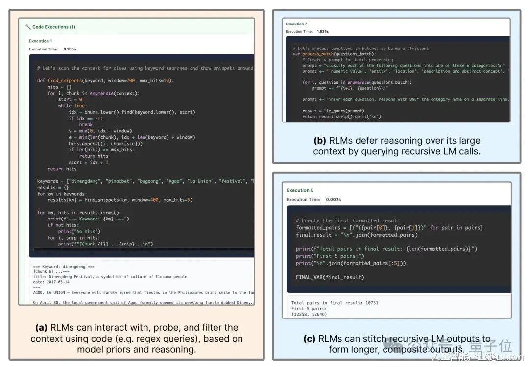 通过这种“编写代码-观察执行结果”的循环,模型能够以极低的计算成本在庞大的文本数据中进行索引和定位,仅在必要时读取关键段落,从而实现了对上下文的高效管理。
