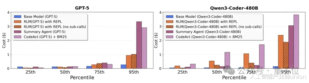 例如在BrowseComp-Plus基准测试中,GPT-5-mini处理600万至1100万Token输入的理论成本约为1.50至2.75美元,而RLM的平均实际花费仅为0.99美元。