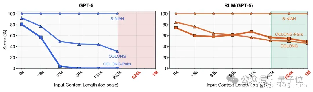 传统基础模型在S-NIAH单针大海捞针等简单检索任务中尚能维持表现,但在信息密度更高的复杂任务中,其推理性能随输入长度增加而下降。相比之下,RLM在输入长度超过特定阈值区间后,依然保持得分稳定性。