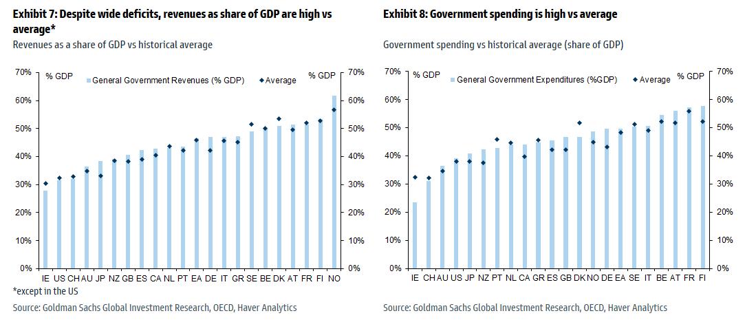 鉴于利息成本的上升轨迹,来自这一来源的政府预算压力正在增加。鉴于许多国家(尤其是欧洲)目前的支出(图表8)和收入(图表7)都高于历史平均水平,这项挑战是逐步削减赤字任务的额外挑战。美国是一个重要的例外,其收入低于历史平均水平。