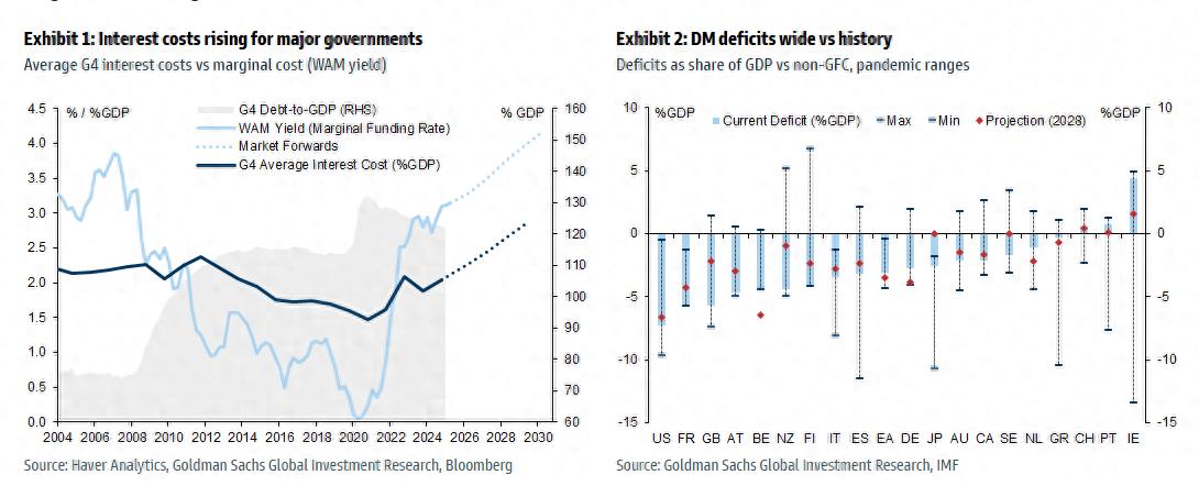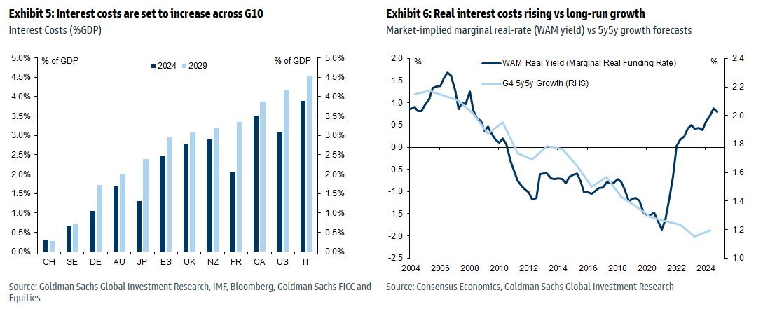 主要央行已开始从周期峰值下调利率,但政府利息成本仍在上升。现有债务存量(处于历史高位)正在以更高的利率进行再融资。