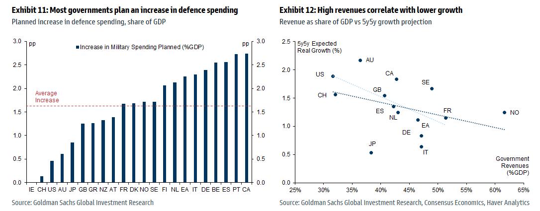 此外,医疗保健支出(几乎所有地区的第二大类别)也接近大多数国家的历史高位。利息成本并非唯一可能上升的支出类别。欧洲及其他地区的国防支出预计将增加(图表11)。