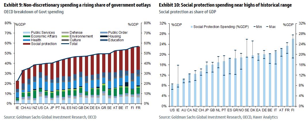 近期支出的增长在很大程度上导致了非自由支配类别(例如医疗和社会保障)的支出水平上升(图表9)。大部分社会支出发生在欧洲,其占GDP的比重远高于其他经济体,目前已接近历史高位(图表10)。