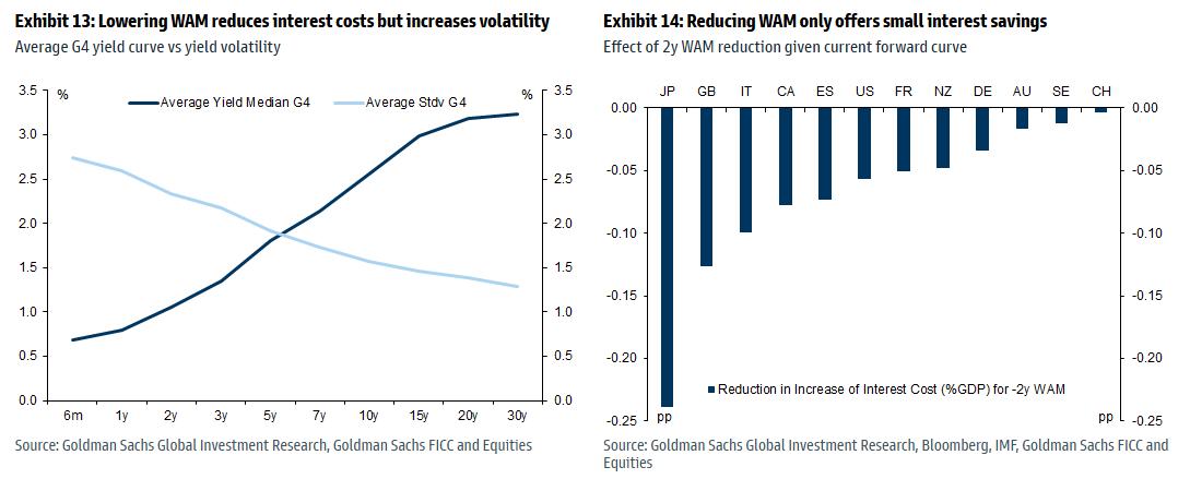 随着利率上升,G10 经济体的加权平均利率(WAM)已开始下降。正如高盛之前所指出的,最佳发行策略是在高利率时期(甚至出现倒挂曲线)偏向短期,以最大限度地节省长期利息成本。但该策略的可行性在不同市场有所不同。例如,WAM 已经较短的国家(例如美国和加拿大)可能会发现进一步将债务发行转向较短期限更具挑战性。