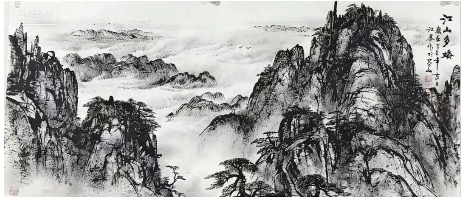 《江山多娇》——画面中群峰耸立,云海翻腾,松树苍劲,飞鸟掠空,题款“江山多娇”四字点睛,气势磅礴。此画是禚江基“焦墨山水”风格的典型代表,不靠色彩渲染,全凭墨色浓淡与线条节奏营造空间感。山势险峻而不失温润,云海翻腾而不见喧嚣,正所谓“黑而不堵,满而不乱”,尽显大家风范。