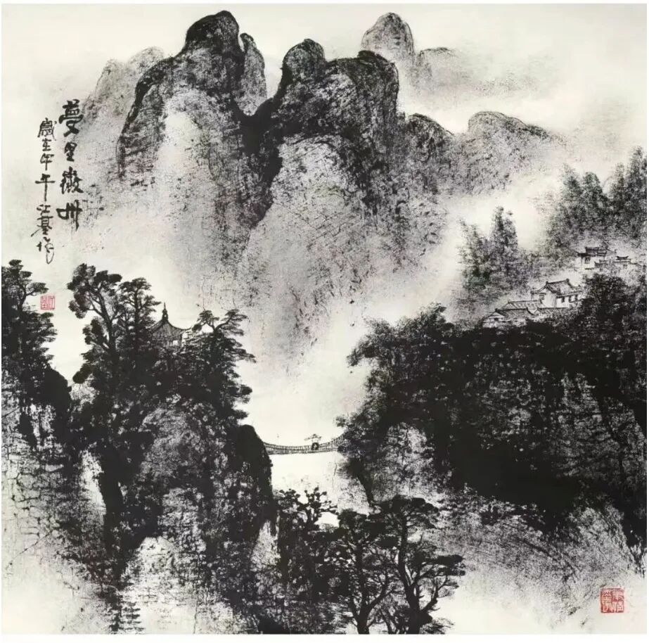 《前程似锦》——此画以“枯笔焦墨”为主,通过浓淡干湿的极致对比,营造出“山骨嶙峋,水气氤氲”的视觉张力,既具北方山水的雄浑气魄,又含南方水墨的温润灵秀;既保留了传统水墨的“骨力”,又赋予画面现代构成的节奏感,使山石不落“软媚”窠臼,反显“苍劲”之气。