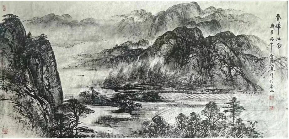 《春醉江南》——以苍劲枯笔为骨,淡墨晕染为魂,在素纸上晕开一派江南春山的温润与辽阔。整幅画以焦墨为底,却无凛冽之气,反而在黑白交错间藏尽江南春韵。枯笔的苍劲、飞白的空灵、淡墨的温润,在笔触流转中勾勒出春山的肌理,让观者在黑白光影里,触摸到东方山水里“春和景明,万物复苏”的温柔意趣。