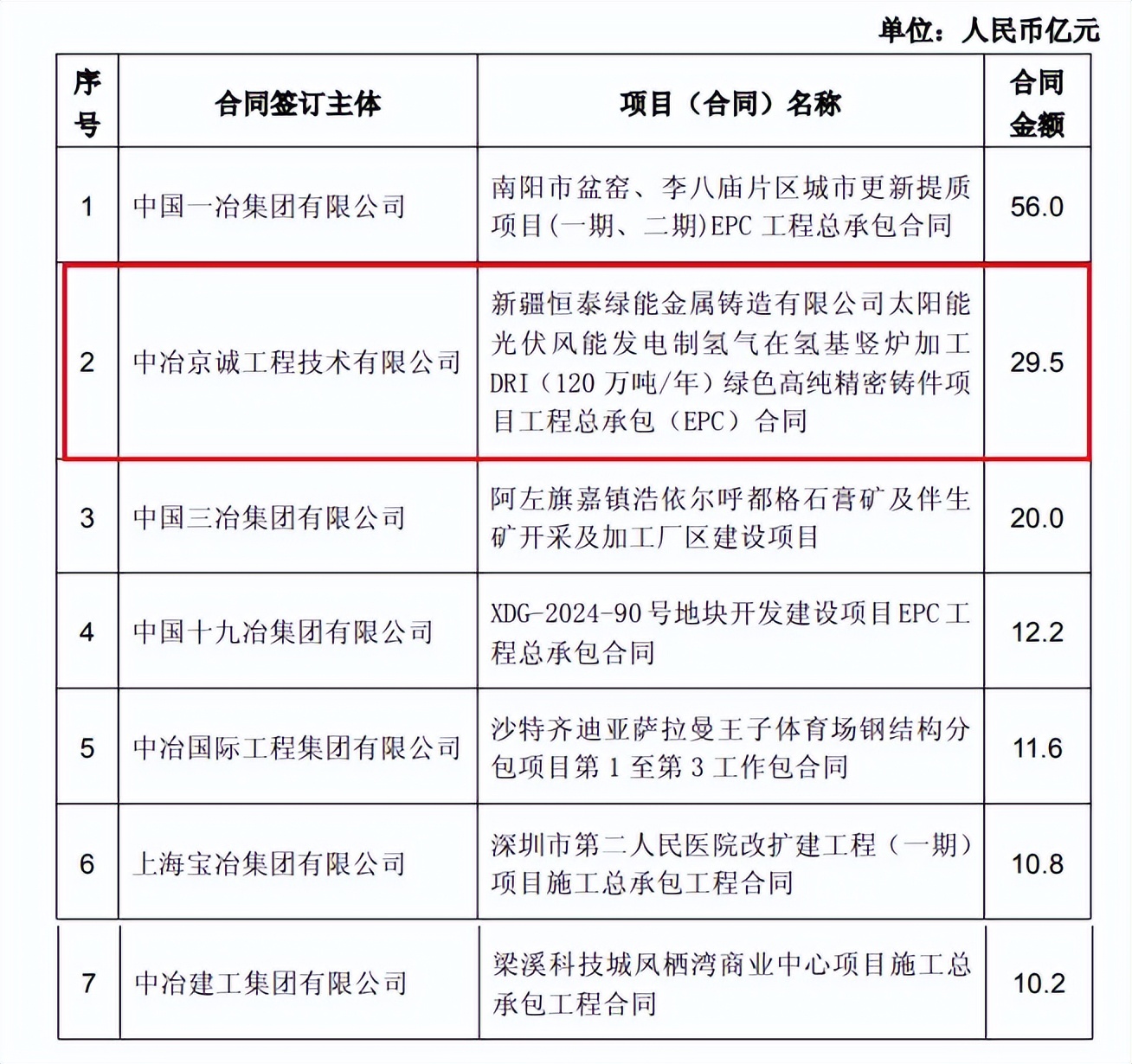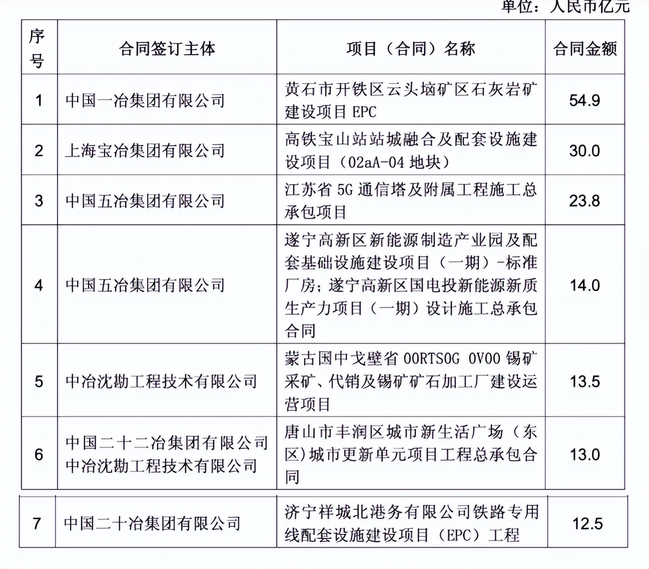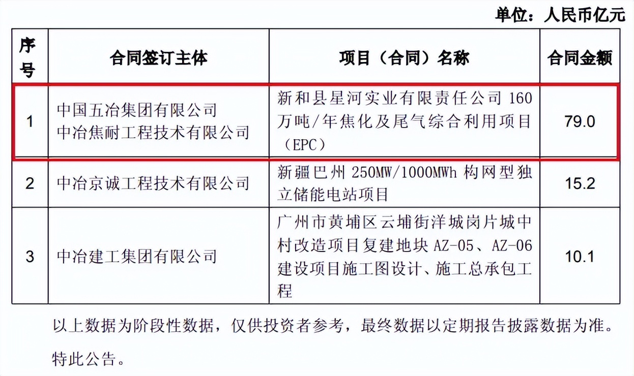 冶金领域,2025年11月,中冶京诚工程技术有限公司签新疆恒泰绿能金属铸造有限公司太阳能光伏风能发电制氢气在氢基竖炉加工DRI(120万吨/年)绿色高纯精密铸件项目工程总承包(EPC)合同,合同金额29.5亿元;2025年9月,中国三冶集团有限公司新签香格里拉市洪鑫矿业有限责任公司雪鸡坪铜矿采、选生产运营整体管理项目,合同金额13.5亿元;2025年9月,上海宝冶集团有限公司新签山东众鑫冶金材料有限公司冷轧涂镀项目建安总承包工程合同,合同金额23亿元;上海宝冶集团有限公司新签山东钢铁集团永锋临港有限公司临港先进优特钢产业基地二期(二步)项目建安总承包工程合同,合同金额11.8亿元;此外,上海宝冶集团有限公司签约山西通才工贸有限公司年产100万吨能源新材料精品钢管生产线建设项目EPC总承包工程合同 ,合同金额11.8亿元;中国五冶集团有限公司、中冶焦耐工程技术有限公司签新和县星河实业有限责任公司160万吨/年焦化及尾气综合利用项目(EPC),合同金额79亿元。中国一冶集团有限公司、中冶建筑研究总院有限公司签约三门峡高新区铜基新材料产业园EPC总承包项目,合同额18.3亿元。中冶焦耐工程技术有限公司签约哈萨克斯坦 Qarmet No.8&9 焦化项目供货合同,合同金额12.7亿元。