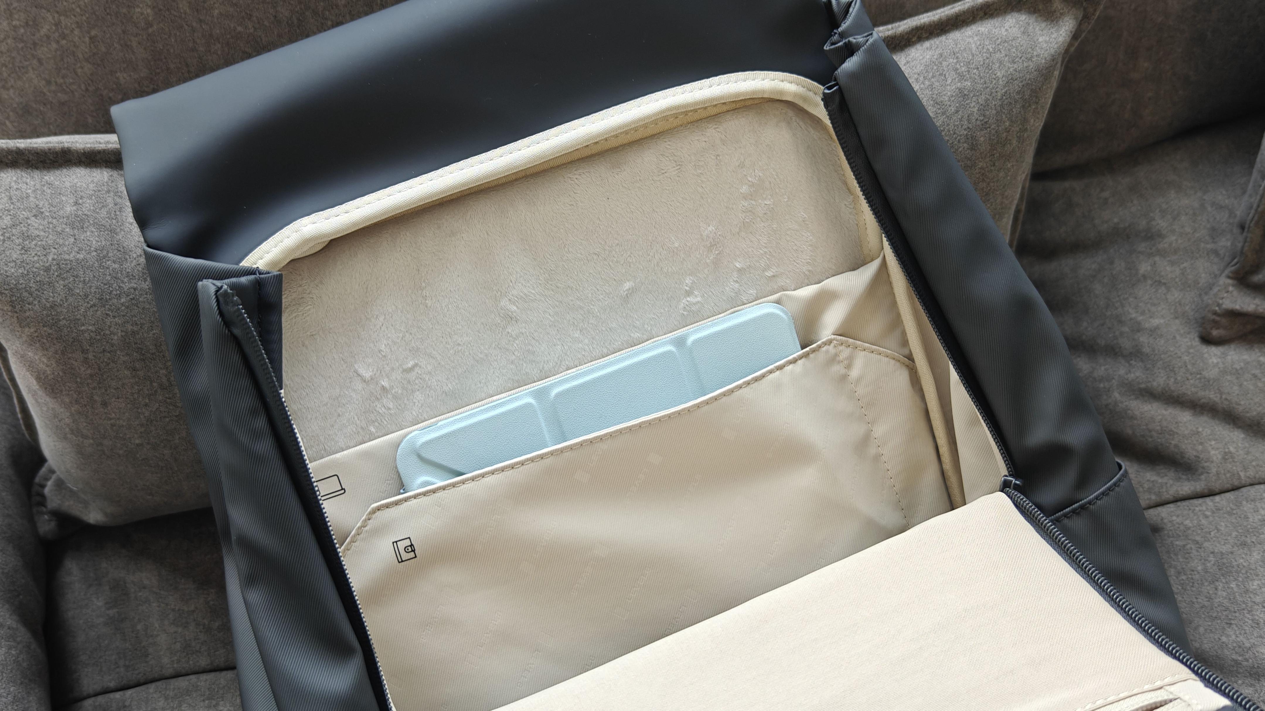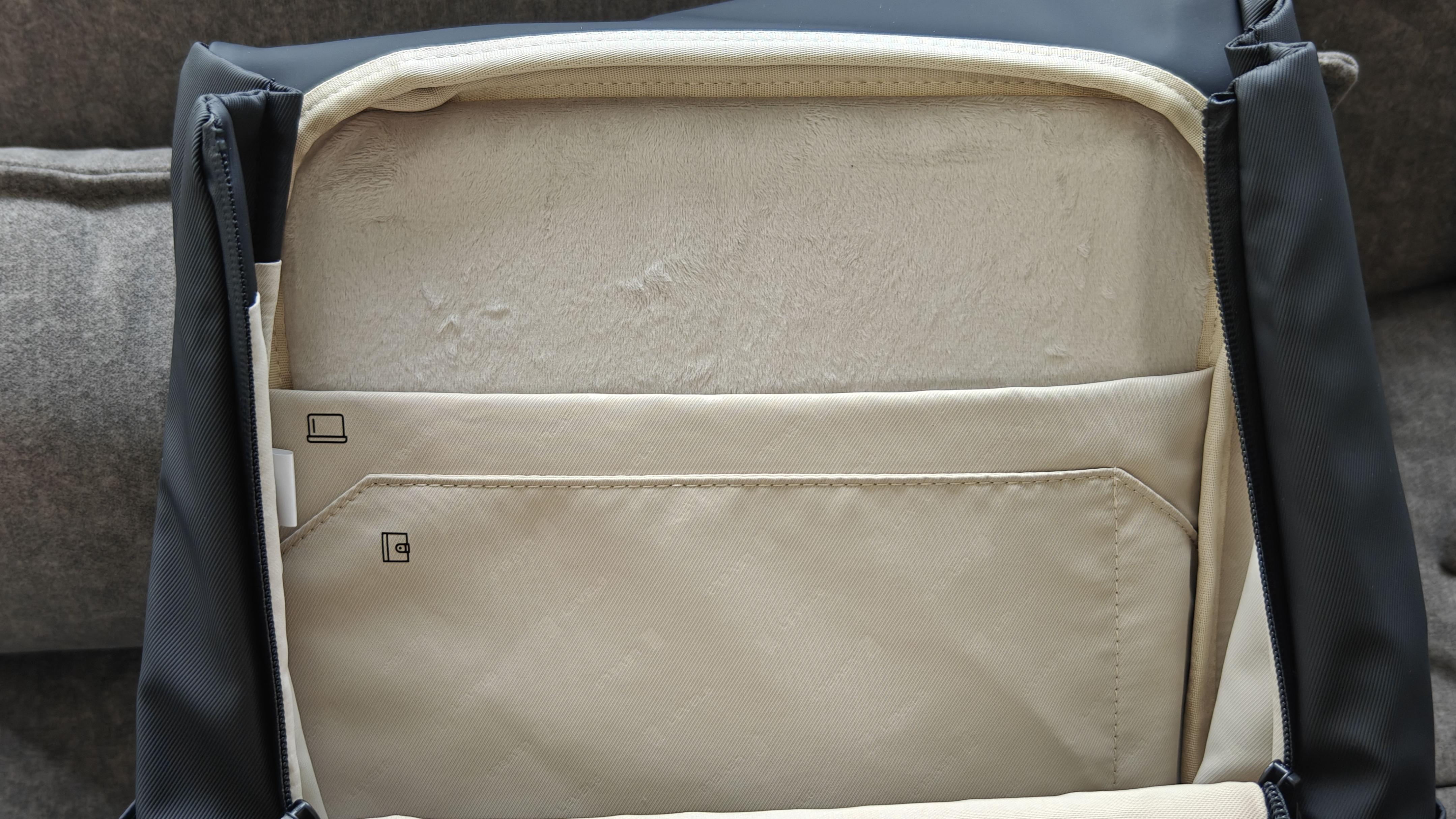地平线8号moment背包内有快取电脑仓,最大可收纳15.6英寸的笔记本电脑。这个隔层内有大量毛绒,底部也有减震加固设计,一是起到避震的效果,保护笔记本电脑,二是提升摩擦力,避免在运动中滑动移位、磕碰刮擦,同时柔软亲肤不磨机身,就算是频繁赶路、上下颠簸,也能牢牢固定电脑,让机身与屏幕始终安稳无恙。