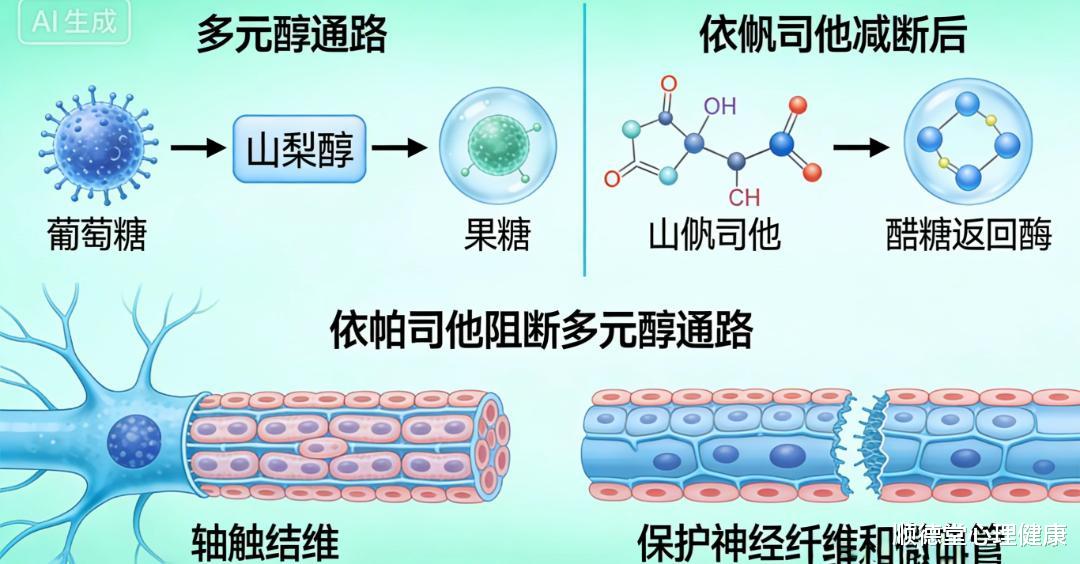 依帕司他阻断多元醇通路,改善代谢性微循环损伤。依帕司他是醛糖还原酶抑制剂,专门抑制高糖激活的多元醇通路,减少神经与微血管内山梨醇蓄积,避免细胞水肿,神经纤维脱髓鞘与微血管狭窄。它对糖尿病周围神经病变的感觉异常麻木有明显改善作用,也能延缓肾脏微血管的代谢损伤。依帕司,他是对因治疗的代谢保护药,更适合于神经症状为主,合并代谢紊乱的患者,与硫辛酸联合使用,可实现抗氧化和抑制代谢紊乱双通路保护,效果优于单药。