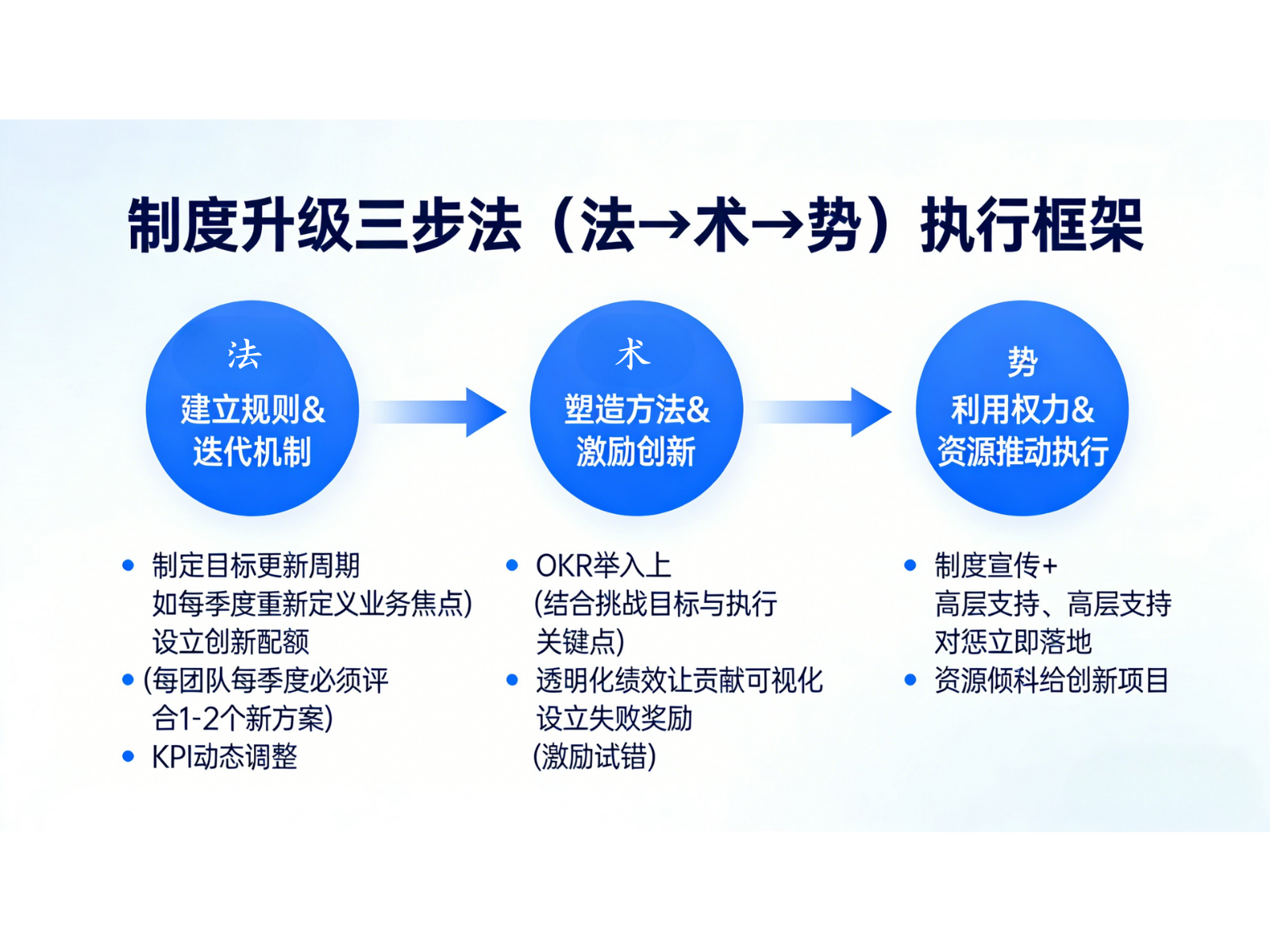 操作建议:将创新成果纳入年度绩效的硬性指标,并占比不少于总绩效的30%,以制度逼迫创新成为习惯。