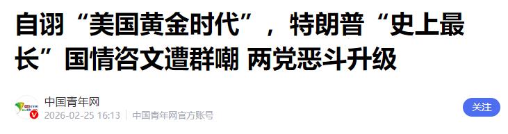 喜欢看热闹的美国民众没有让他失望。据相关数据显示,特朗普的国情咨文演讲电视收率峰值超过4500万,为特朗普第二任期最高,美国社交媒体热度居高不下,创美国总统演讲实时热度新纪录,相关话题热搜一度登顶全球第一。