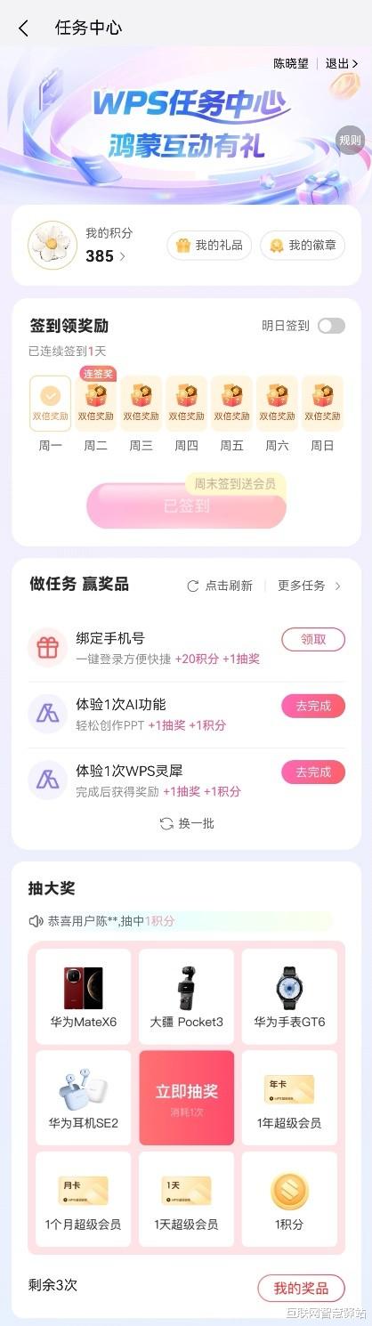 现在兑换WPS会员还有限时活动,额外加赠了7天WPS会员,等于这月卡有38天!还没完!WPS里还有个针对鸿蒙用户的专属活动,每天签到得积分、体验下AI功能就能攒抽奖机会,奖品有华为Mate X6、华为手表GT6和超级会员年卡等等!我马上去参加,梦想还是要有的,万一呢?