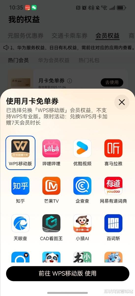 原来,只要是符合升级条件的华为手机,把系统升到鸿蒙5.1及以上版本,在桌面往右滑进负一屏,就能在“鸿蒙有礼”活动中签到得到随机权益。每天点一下签到,跟开盲盒似的,有机会抽到各种华为应用会员,还有月卡免单券,用这个券就可以兑换1个月免费的WPS会员!