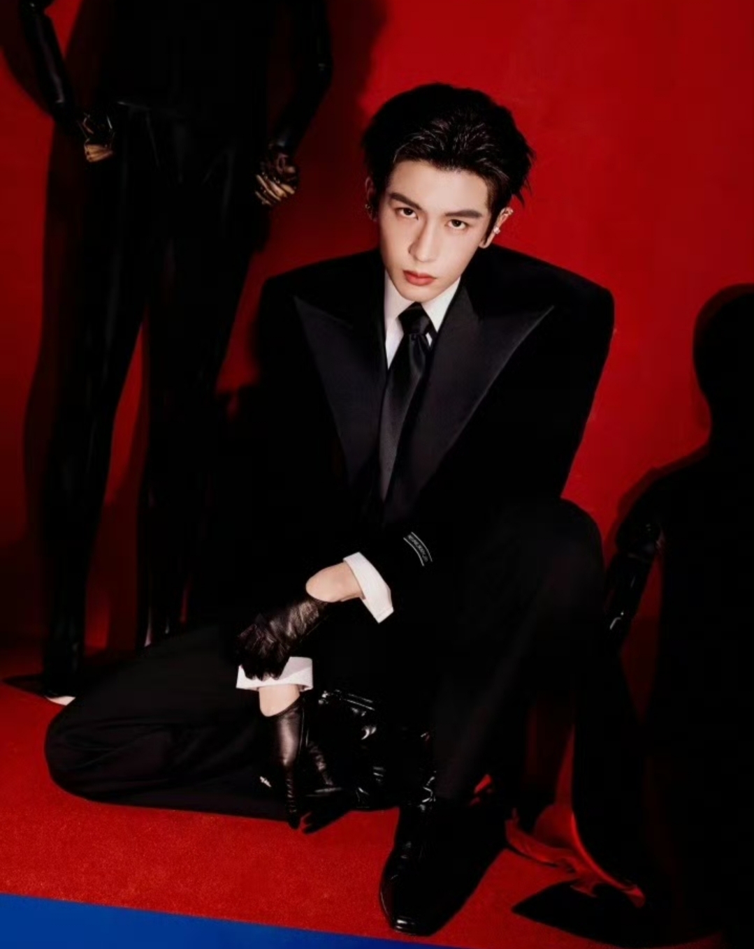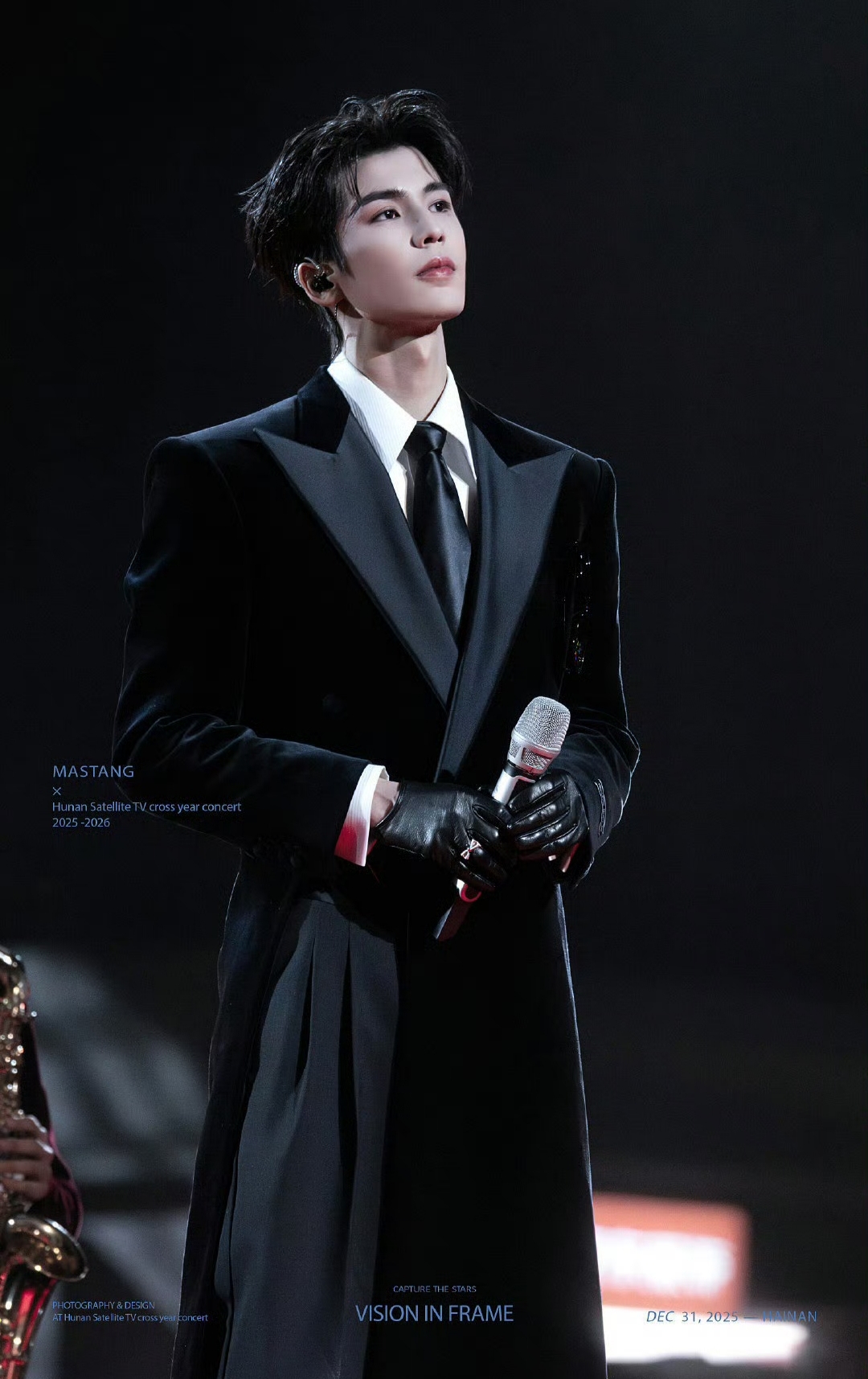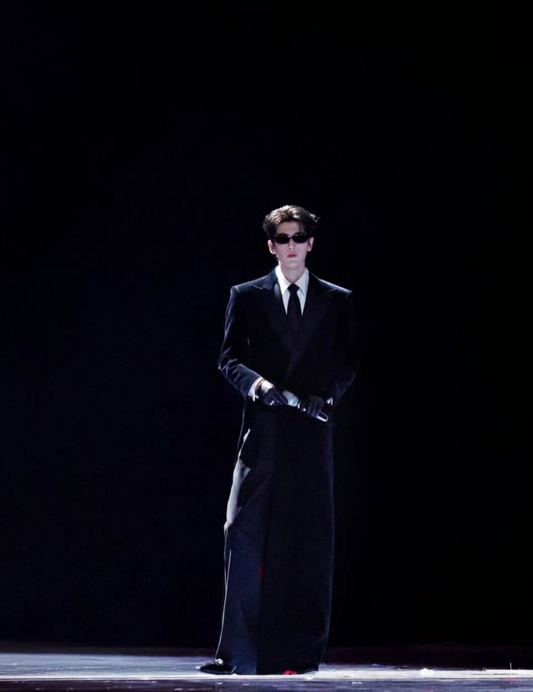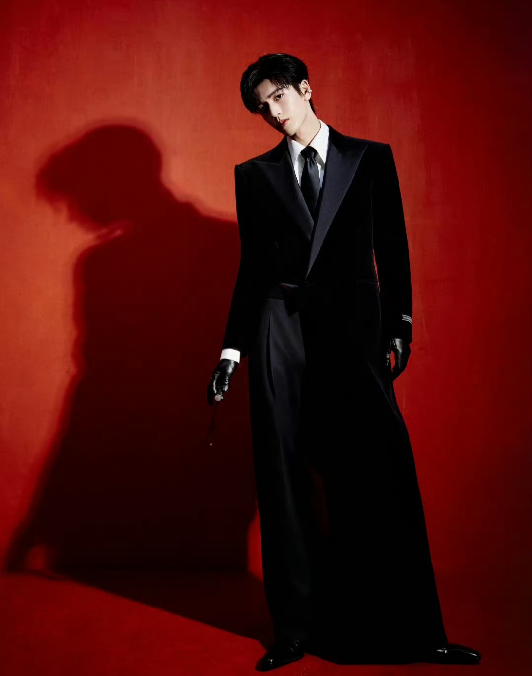 早在晚会彩排阶段,张凌赫的造型便已引发猜测。网友曝光的花絮中,他身着黑色皮衣、墨镜遮面,冷峻台步被戏称“把彩排走成高定秀场”。而正式舞台的造型更是升级:Xander Zhou为其量身定制的红黑丝绒戗驳领大衣,内衬采用暗红色绸缎,行走间若隐若现的光泽与外层哑光丝绒形成强烈对比;皮质手套紧贴修长手指,金属腰链随步伐晃动,湿发背头下雕塑般的五官在灯光下宛如AI建模。更令人惊艳的是,他手持的权杖并非道具,而是由纯银打造、镶嵌黑曜石的定制配饰,重量达1.2公斤,却在他手中被挥洒出轻盈的锋芒。