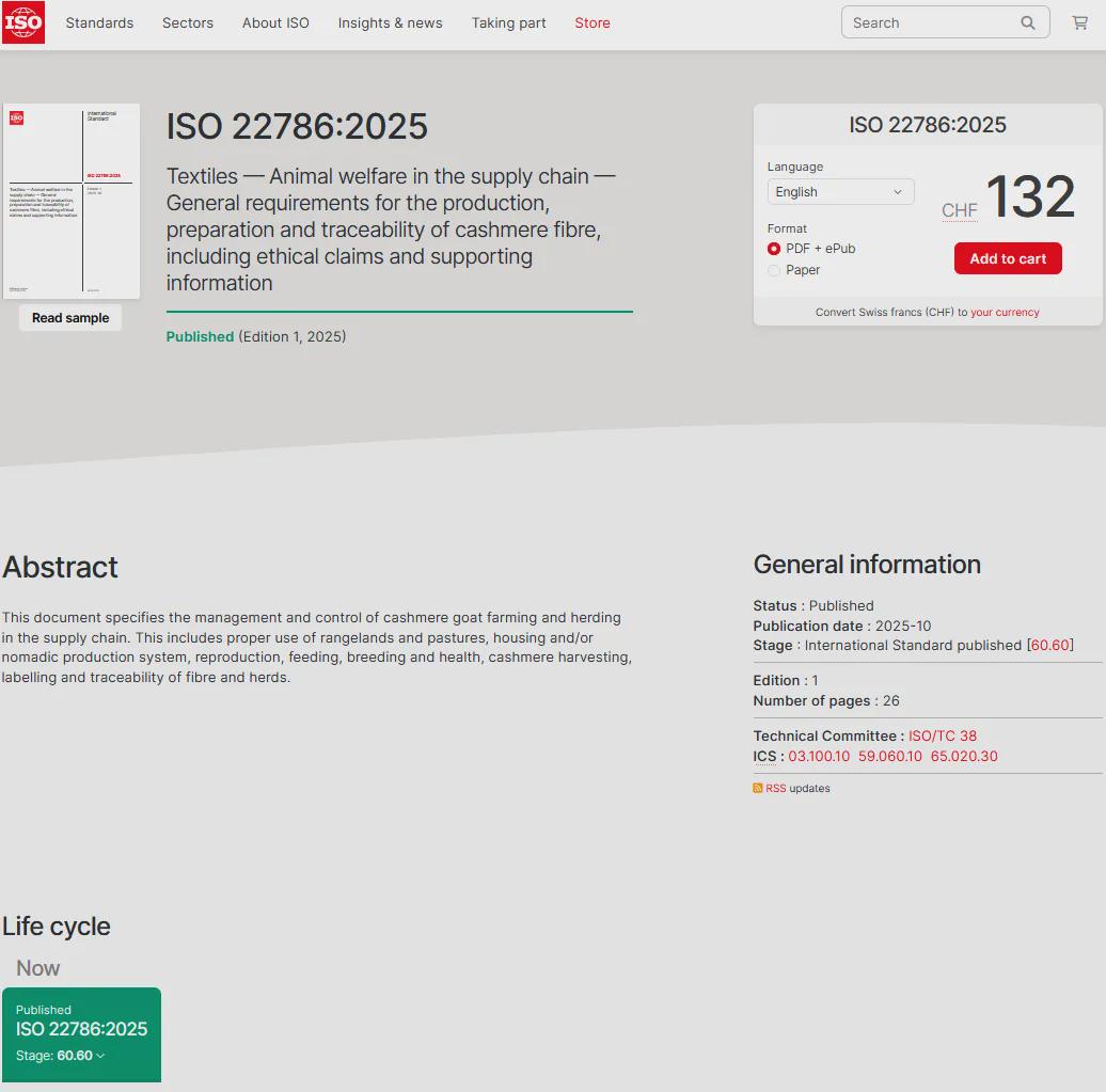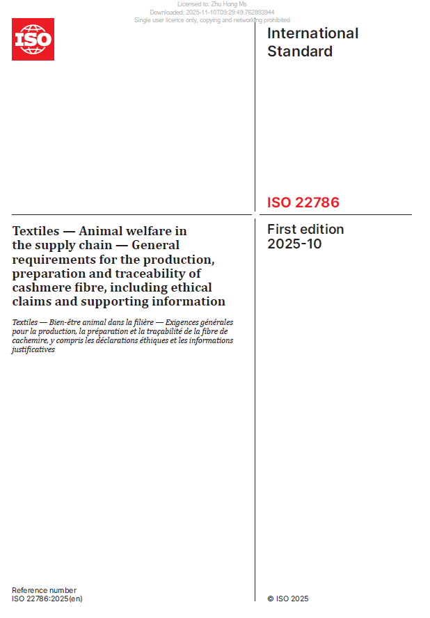 近日,国际标准化组织(ISO)正式发布了一项关乎全球羊绒产业未来的新标准——ISO 22786:2025《纺织品 供应链中的动物福利 山羊绒的生产、制备、标识及可追溯包括道德权益及支持信息的通用要求》。值得关注的是,这项标准是由中国羊绒龙头企业——鄂尔多斯资源股份有限公司主导制定。这已是鄂尔多斯主导完成的第7项国际标准,标志着中国在羊绒领域的规则制定权进一步巩固。