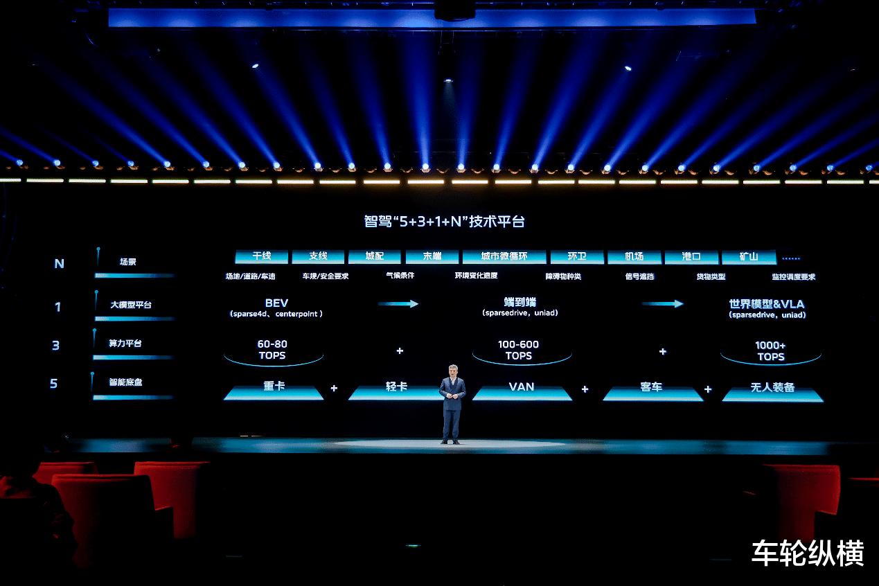 福田汽车打造了 "5+3+1+N" 智驾技术平台:"5" 涵盖重卡、轻卡、VAN、客车和无人装备 5 类智能线控底盘;"3" 提供 60-80TOPS、100-600TOPS、1000+TOPS 三个不同算力平台;"1" 是统一的智能化大模型平台,以端到端为基础,后续逐步拓展到VLA和世界模型;"N" 则代表干线、支线、城配、末端、城市微循环以及机场、矿山、园区等全场景智驾应用落地。