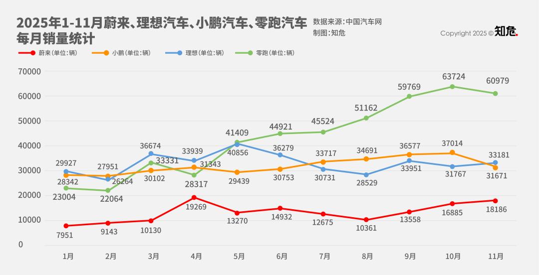 曾经被 “ 蔚小理 ” 压制住的零跑,自今年 5 月起,每月销量持续跑赢过去这些 “ 一线新势力 ”。在 11 月,零跑销量甚至接近小鹏汽车、理想汽车的 2 倍,蔚来汽车的 3 倍。