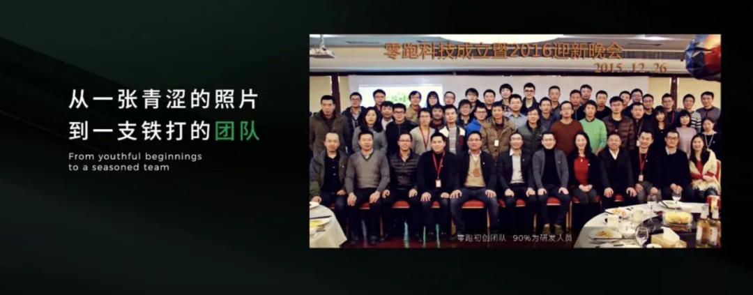 所以在零跑创立之始就将技术放在了第一位。在发布会上,朱江明展示了一张零跑创立第二年迎新晚会的合照,照片里几乎 90% 的成员是研发人员。