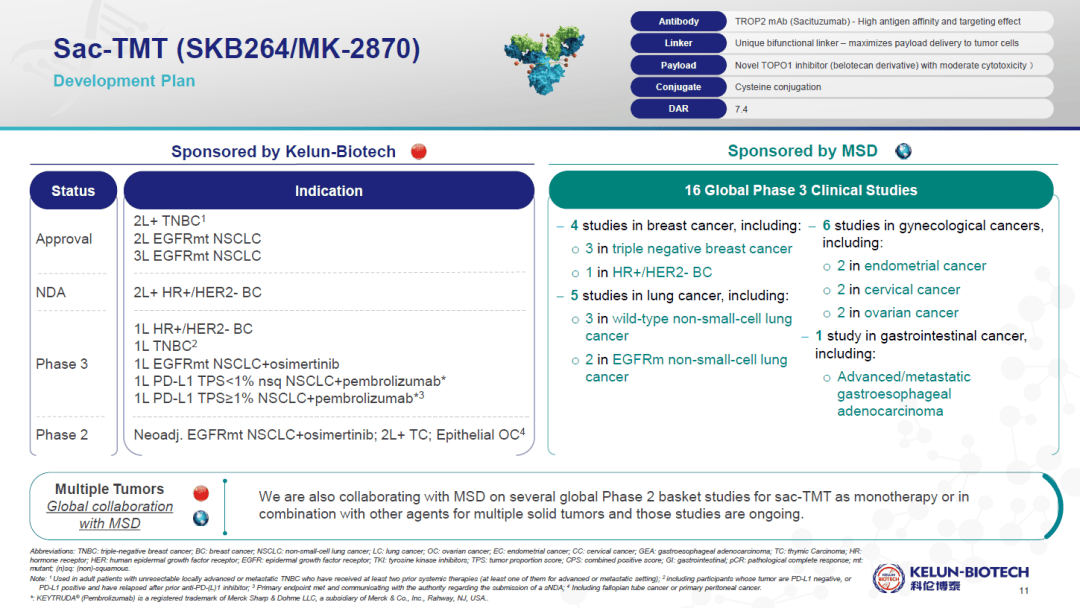 在中国率先取得突破后,科伦博泰与合作伙伴默沙东正加速该药的全球验证。默沙东已围绕芦康沙妥珠单抗布局16项全球III期临床研究,覆盖多个高发癌种,首批全球数据预计于今年读出,推动其正式迈入国际市场。