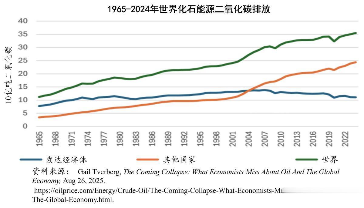 世界上的富裕国家一直在传播这样一种说法:我们最严重的问题是气候变化。在这种情况下,我们可以通过减少化石燃料的使用来帮助防止气候变化,这种说法使得试图解决化石燃料短缺问题成为一种美德,而不是为了防止灾难发生而必须做的事情。然而,当我们研究二氧化碳排放量时(图“1965-2024年世界化石能源二氧化碳排放”),数据表明,即便有了气候变化的叙事,世界化石燃料的二氧化碳排放并没有下降。