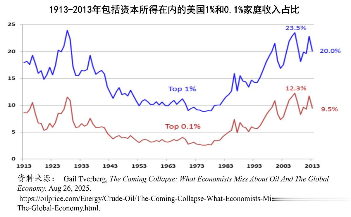 图“1913-2013年包括资本所得在内的美国1%和0.1%家庭收入占比”,显示了收入(包括资本收益)如何在富人和其他人之间分配的分析。在图中没有看到的事实是,总收入在所有这些时期都是趋于上升的。