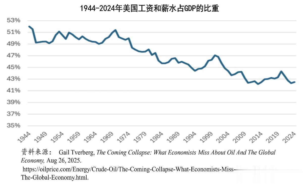 图“1944-2024年美国工资和薪水占GDP的比重”显示,1944年至1970年,工资和薪水占GDP的比例保持良好,但自那以后一直在下降。
