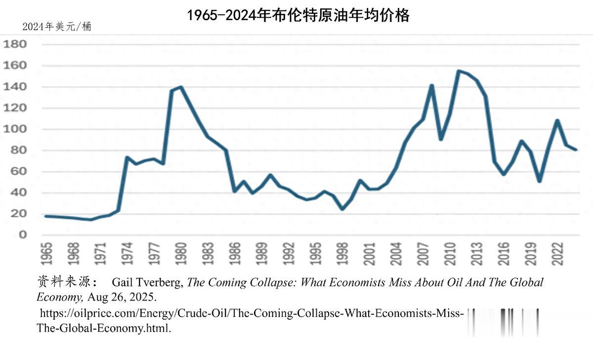 加息导致了几次经济衰退,包括2007-2009年的大衰退。与图“1965-2024年布伦特原油年均价格”的对比显示,在经济衰退期间,石油价格普遍下跌。