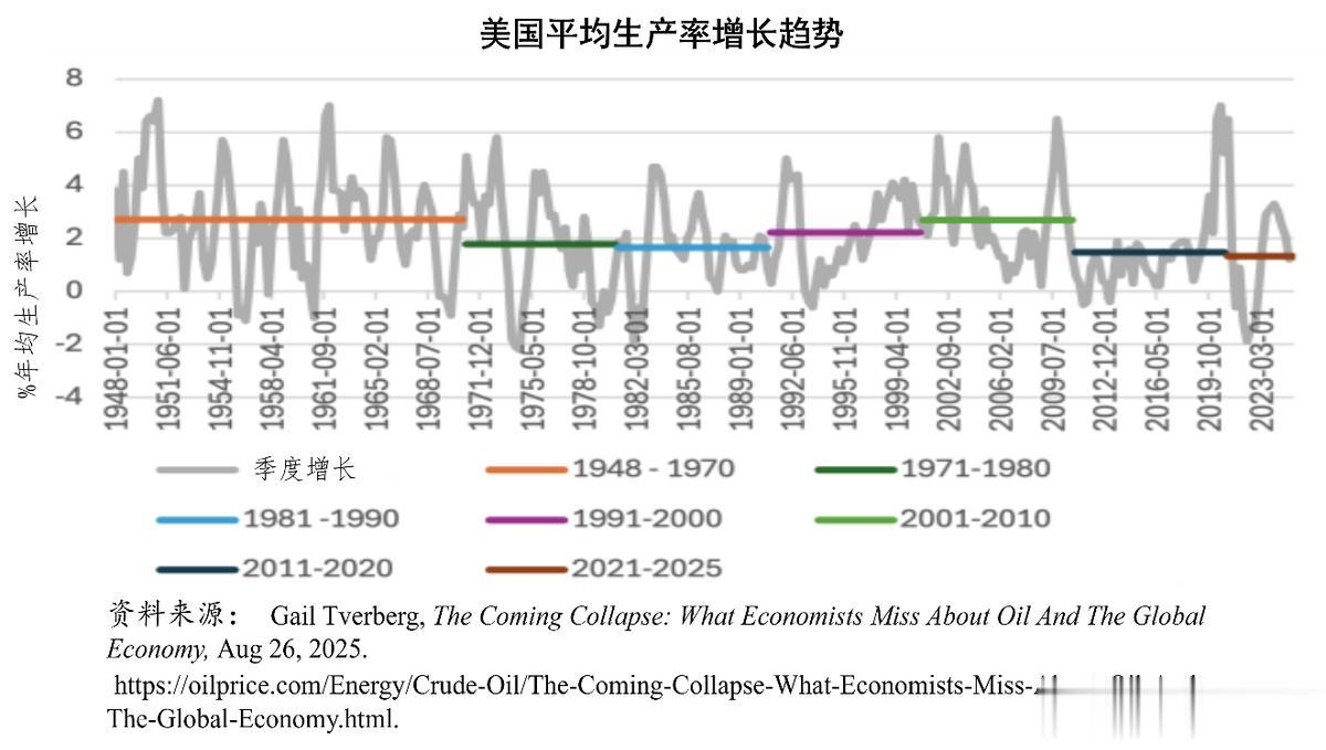 图“美国平均生产率增长趋势”显示了截至2025年6月30日的数据。请注意,即使已经开始使用人工智能,最近一段时间的生产力也低于早期,这是一个令人担忧的情况。